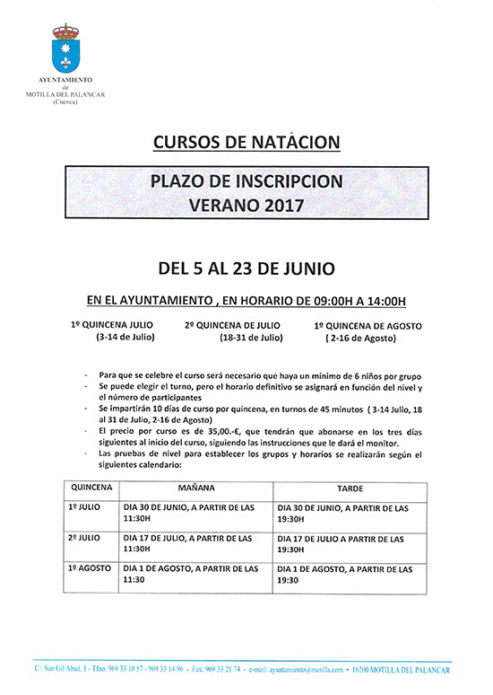 Hoy se han hecho públicos los plazos de matriculación para los cursos de natación este verano de 2017 y la Escuela de Música de Motilla del Palancar para el curso 2017/2018.
