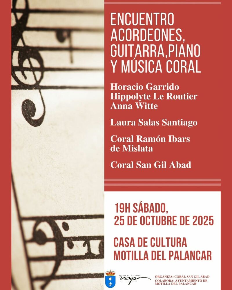 Este sábado 25 de octubre, a las 19:00 horas, la Casa de Cultura de Motilla del Palancar será escenario del "Encuentro de Acordeones, Guitarra, Piano y Música Coral", un evento que reunirá a músicos y corales en una tarde dedicada al arte y la armonía. La entrada será libre hasta completar aforo.