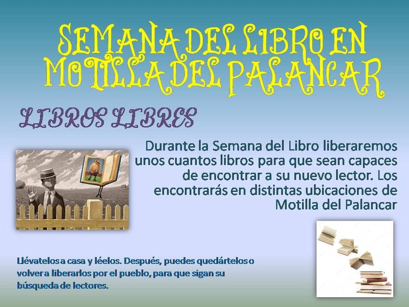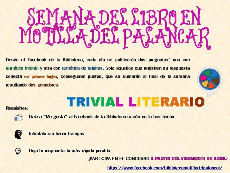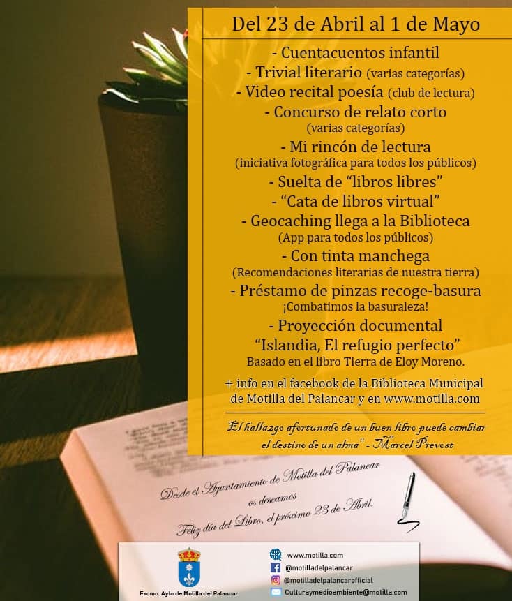 Con motivo del día del libro el próximo 23 de abril y de la mano de la Biblioteca Municipal de Motilla del Palancar, el Ayuntamiento motillano ha preparado actividades para todos los públicos que estarán presentes desde el 23 de abril al 1 de mayo.