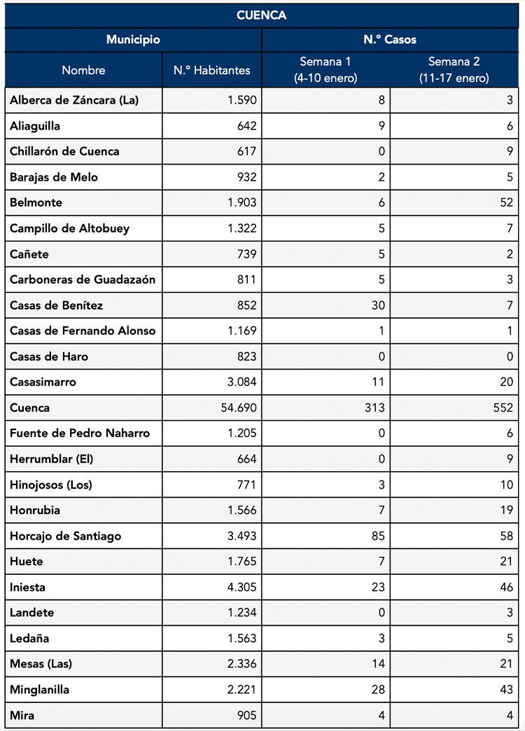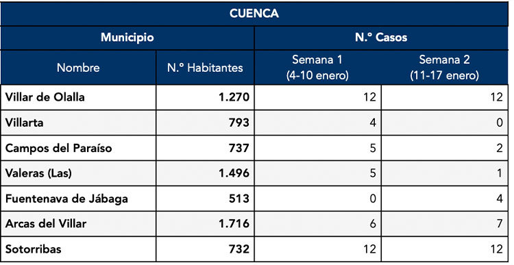 El Gobierno de Castilla-La Mancha, a través de la Dirección General de Salud Pública, ha confirmado 51 nuevos casos en el municipio de Motilla del Palancar. Estos casos de Covid-19 corresponden a la semana epidemiológica 2 (del 11 al 17 de Enero)