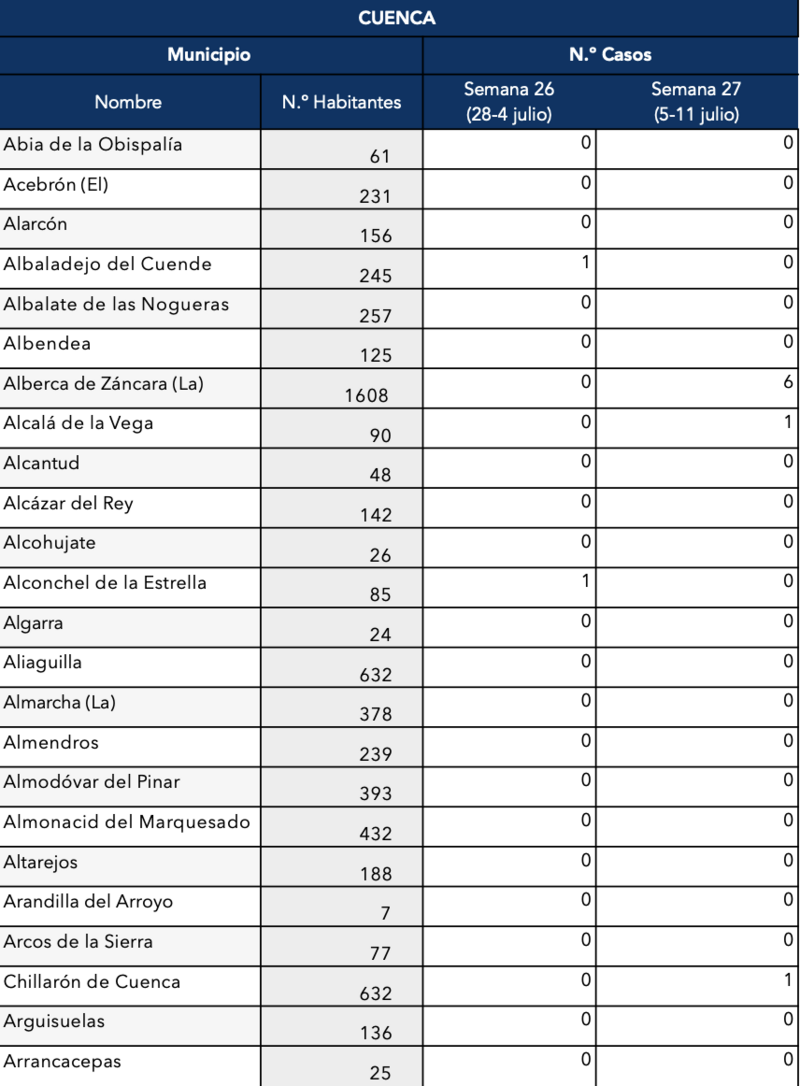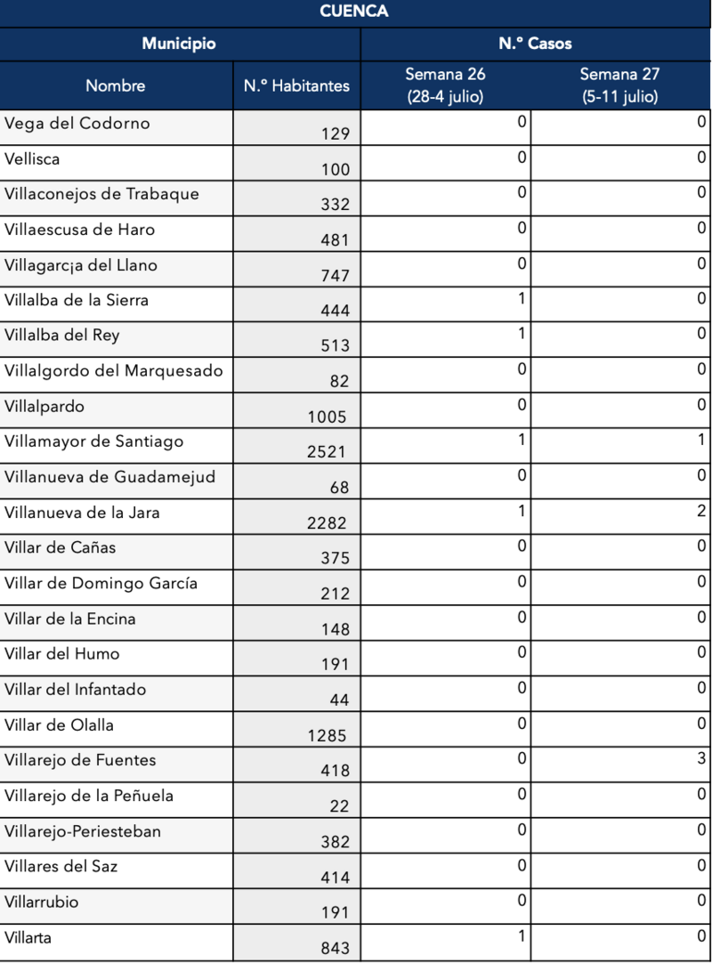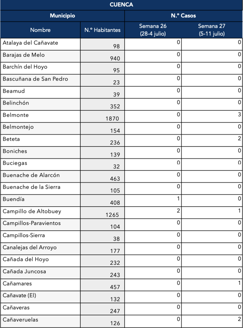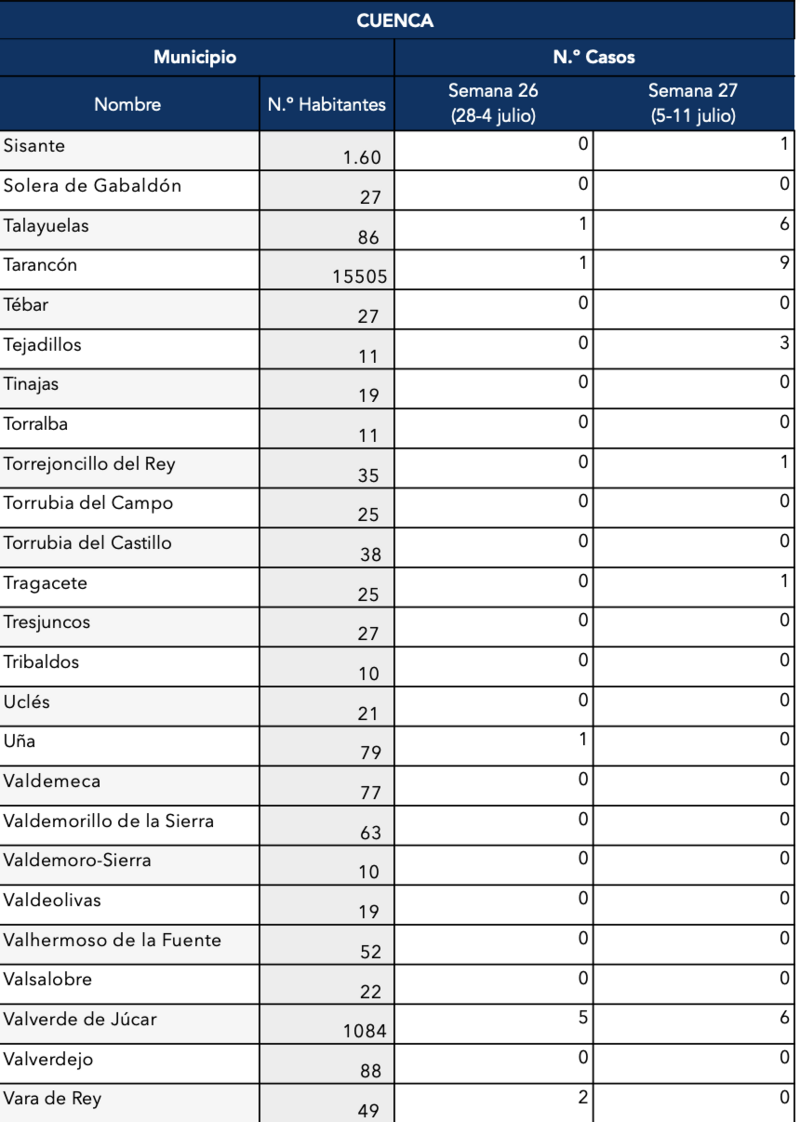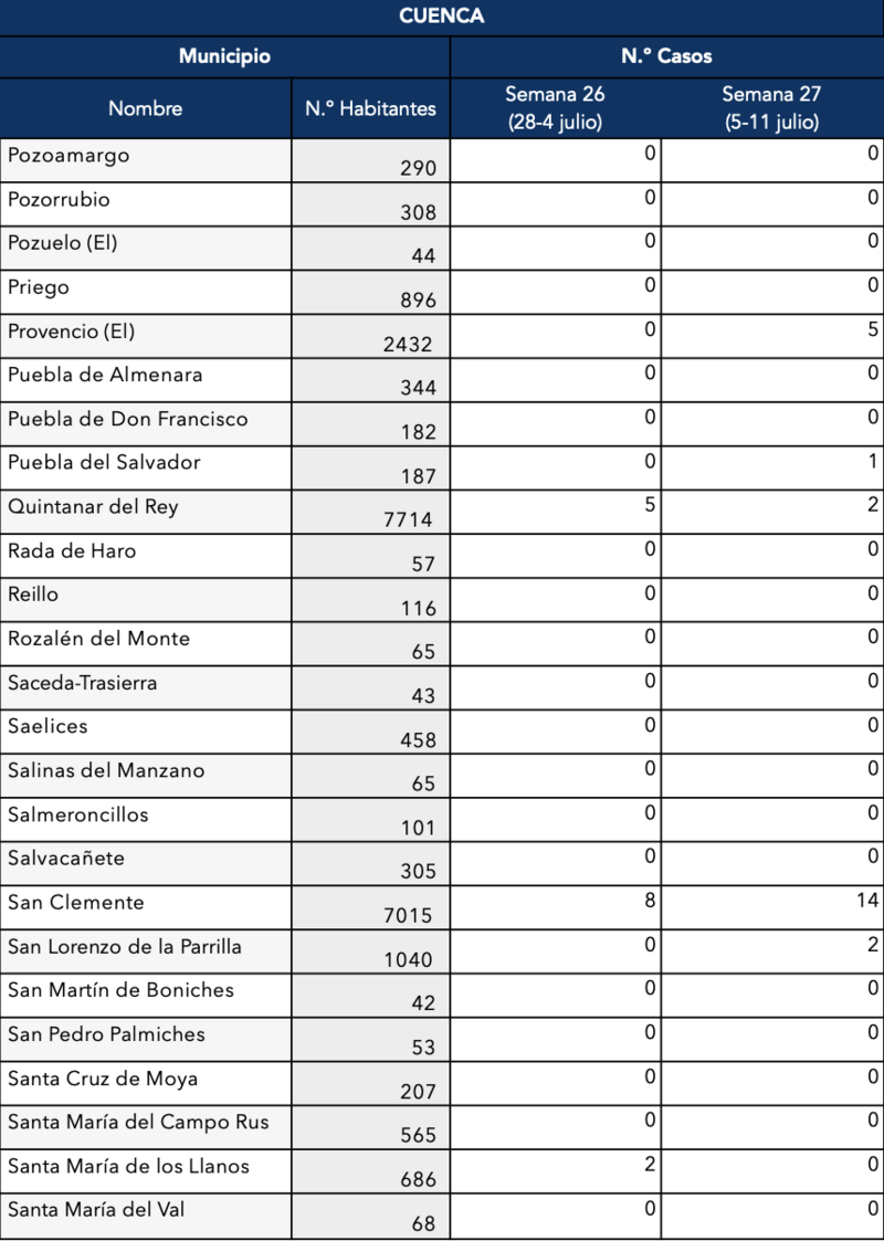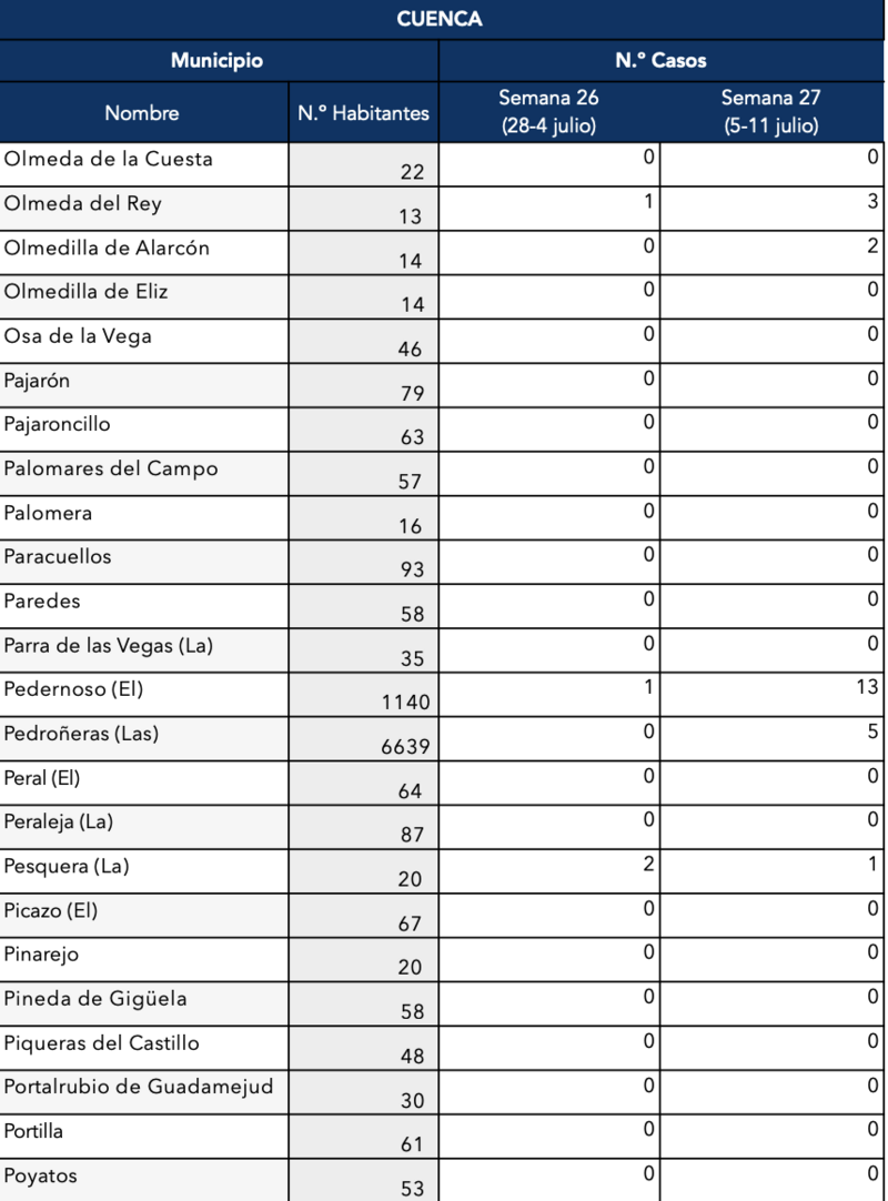 Otras localidades conquenses están sufriendo un preocupante ascenso de casos como Iniesta (se ha confirmado que son 28 esta semana), Mota del Cuervo con 24, 57 en la capital conquense, 13 en El Pedernoso y San Clemente con 14.