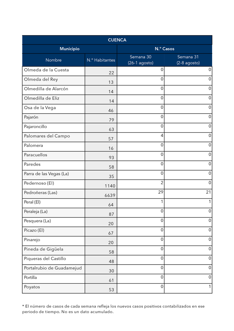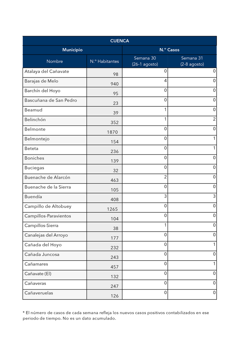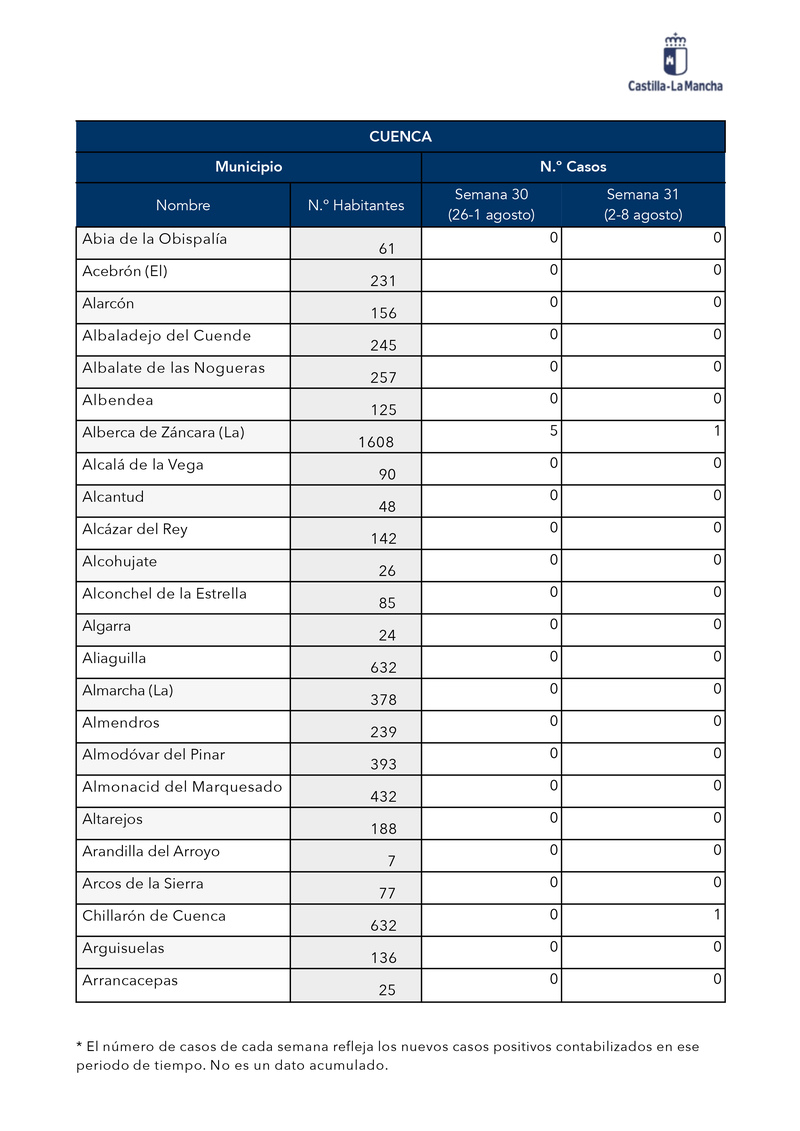 El Gobierno de Castilla-La Mancha, a través de la Dirección General de Salud Pública, ha confirmado que el municipio de Motilla del Palancar cuenta con 3 casos de coronavirus. Estos corresponden a la semana epidemiológica 31 (del 2 al 8 de agosto).
