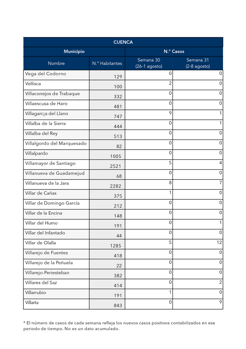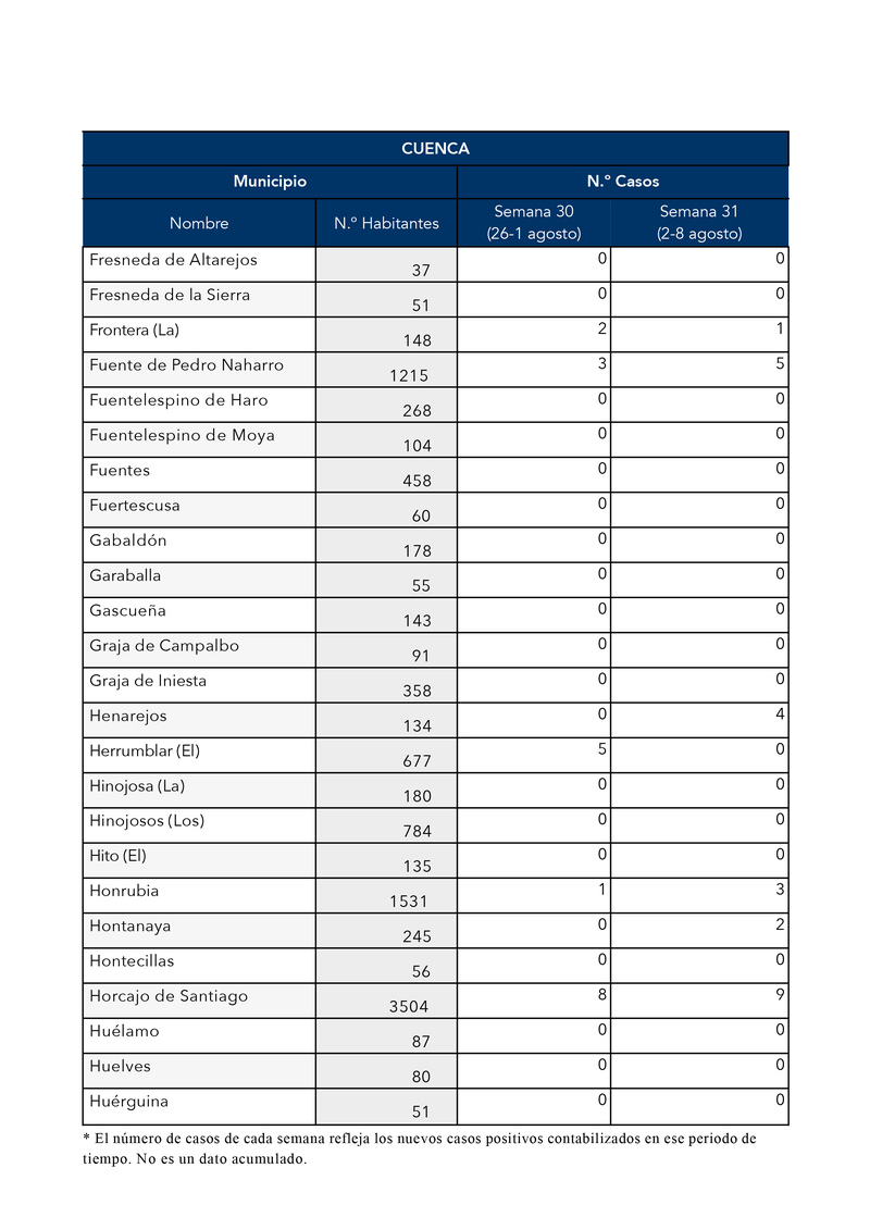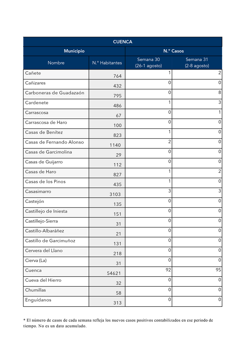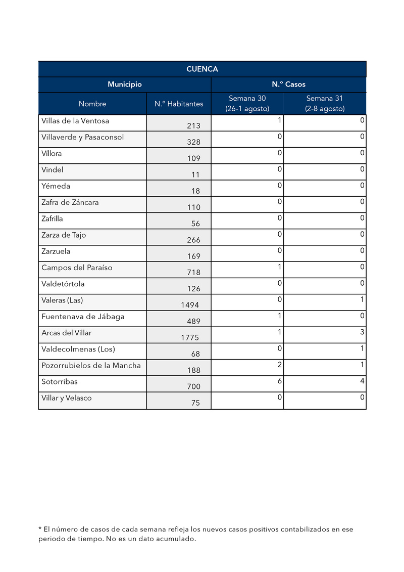 El Gobierno de Castilla-La Mancha, a través de la Dirección General de Salud Pública, ha confirmado que el municipio de Motilla del Palancar cuenta con 3 casos de coronavirus. Estos corresponden a la semana epidemiológica 31 (del 2 al 8 de agosto).