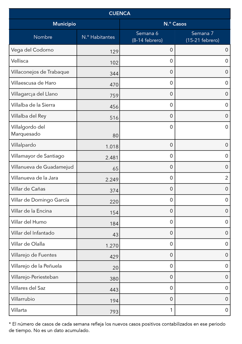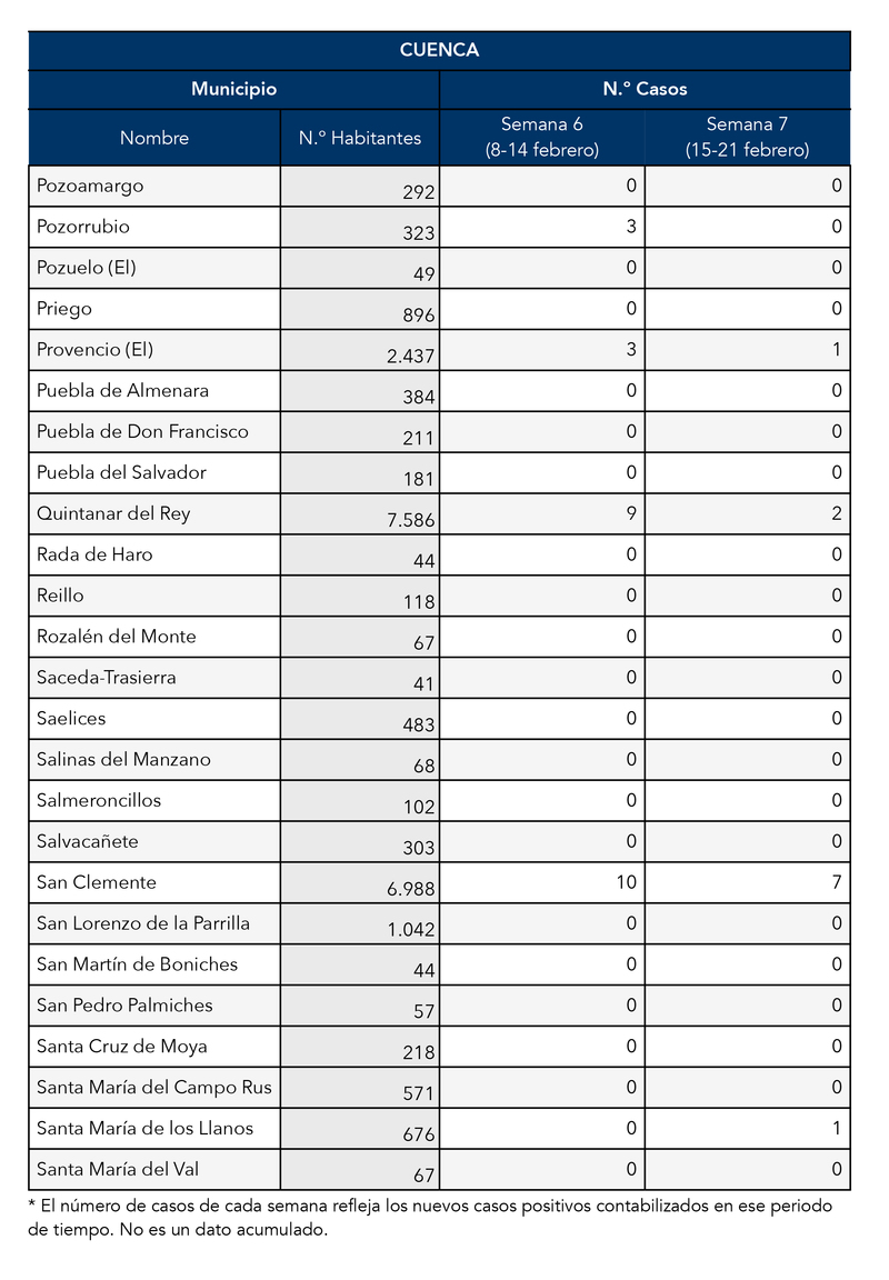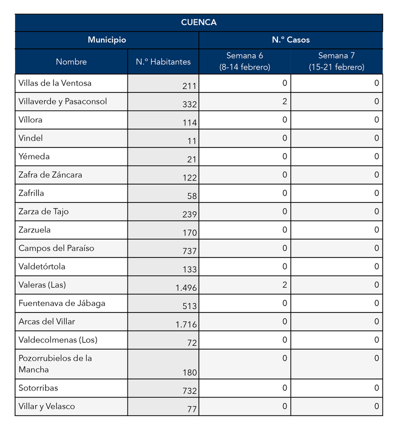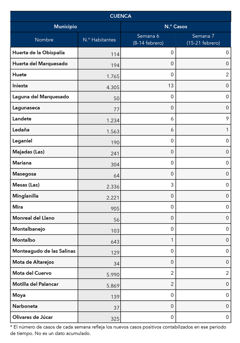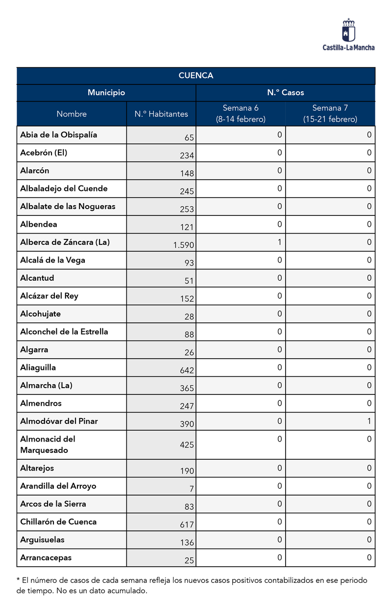 El Gobierno de Castilla-La Mancha, a través de la Dirección General de Salud Pública, ha confirmado que el municipio de Motilla del Palancar cuanta con 0 casos de coronavirus. Estos casos de Covid-19 corresponden a la semana epidemiológica 7 (del 15 al 21 de Febrero)