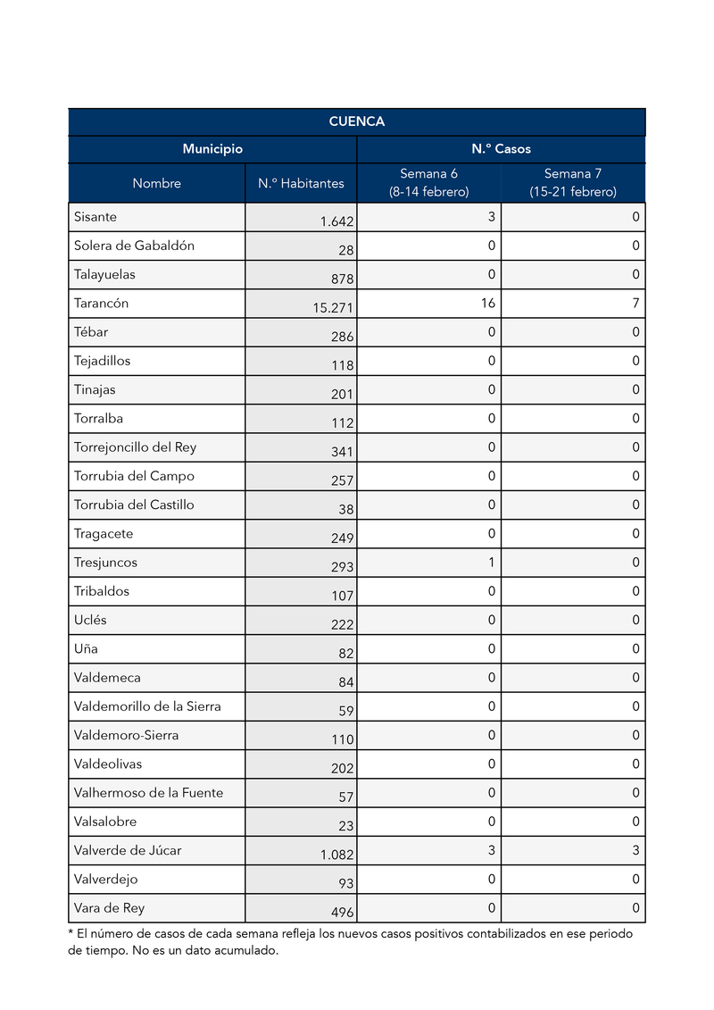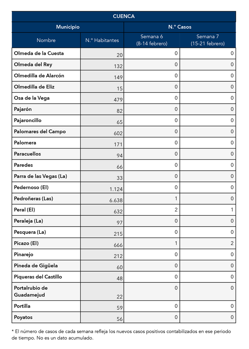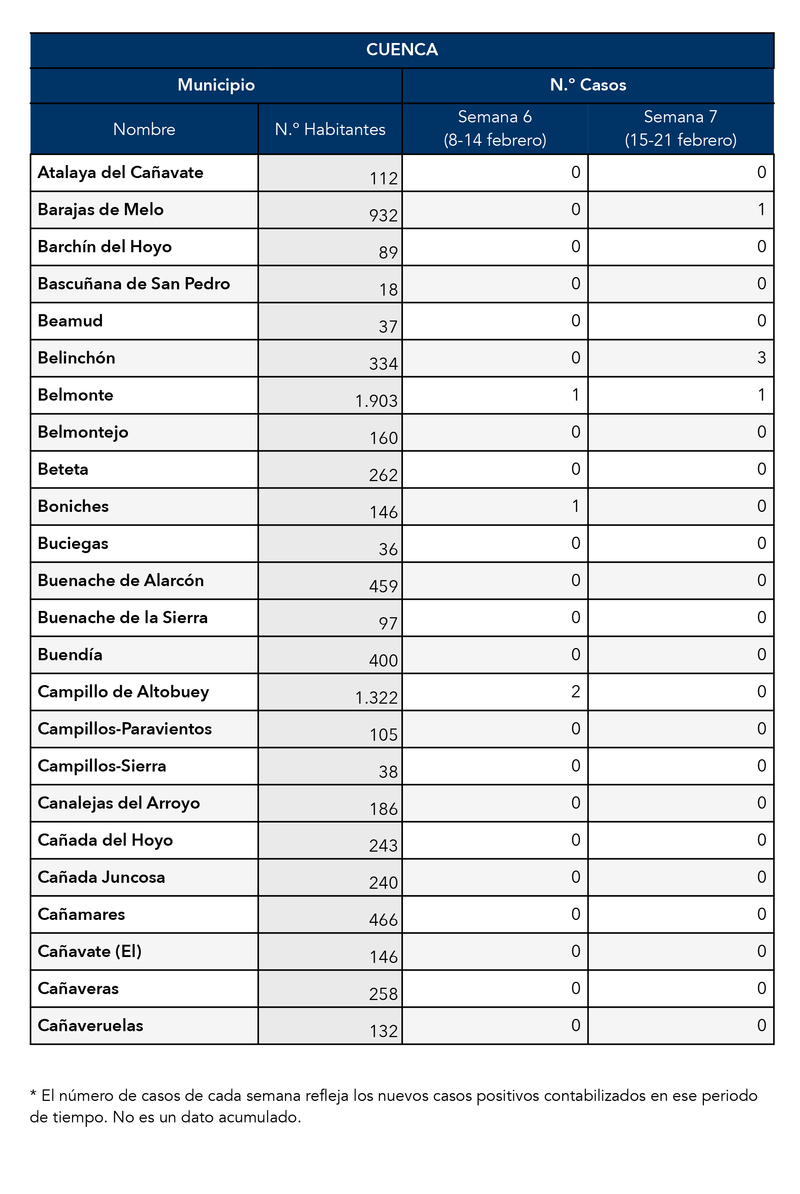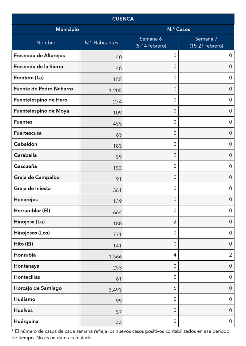 El Gobierno de Castilla-La Mancha, a través de la Dirección General de Salud Pública, ha confirmado que el municipio de Motilla del Palancar cuanta con 0 casos de coronavirus. Estos casos de Covid-19 corresponden a la semana epidemiológica 7 (del 15 al 21 de Febrero)
