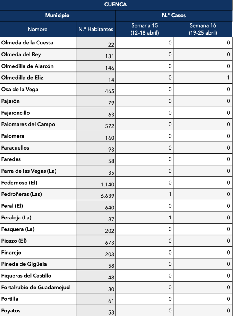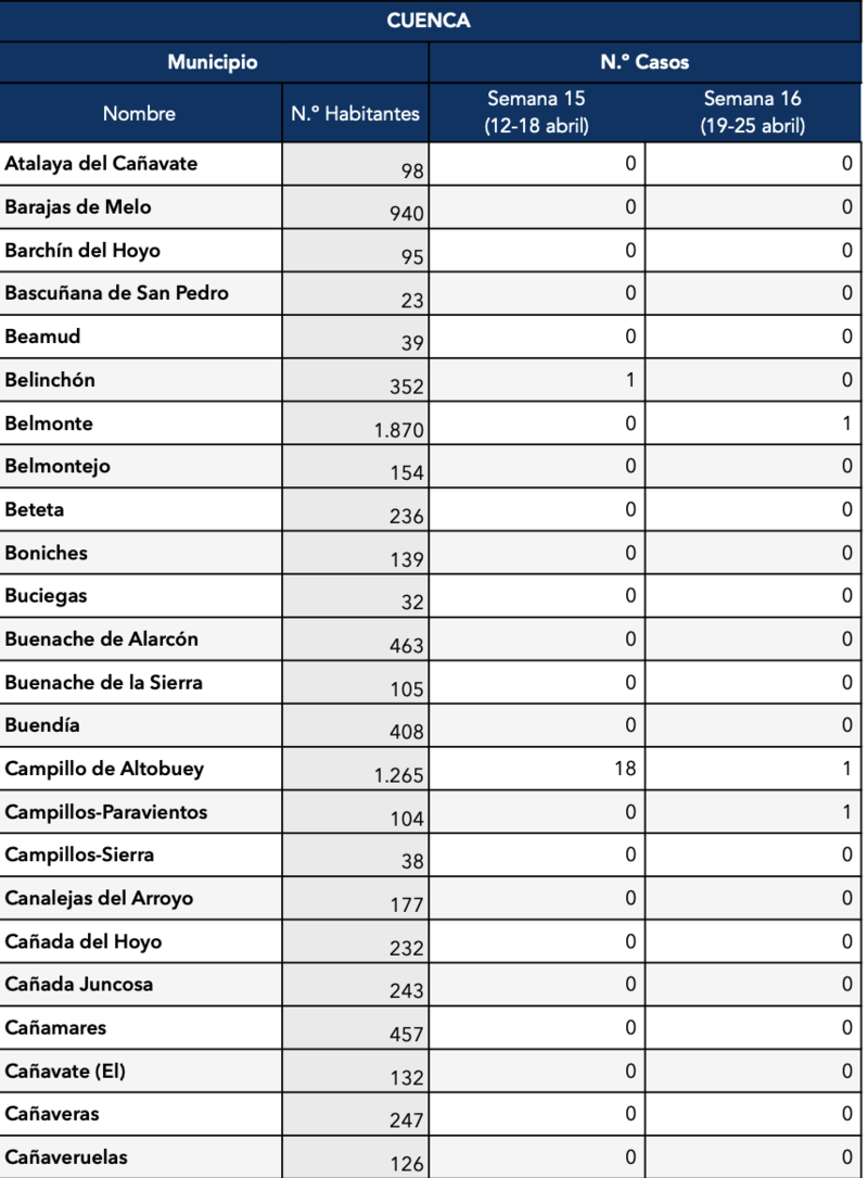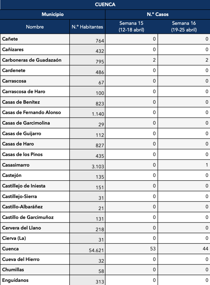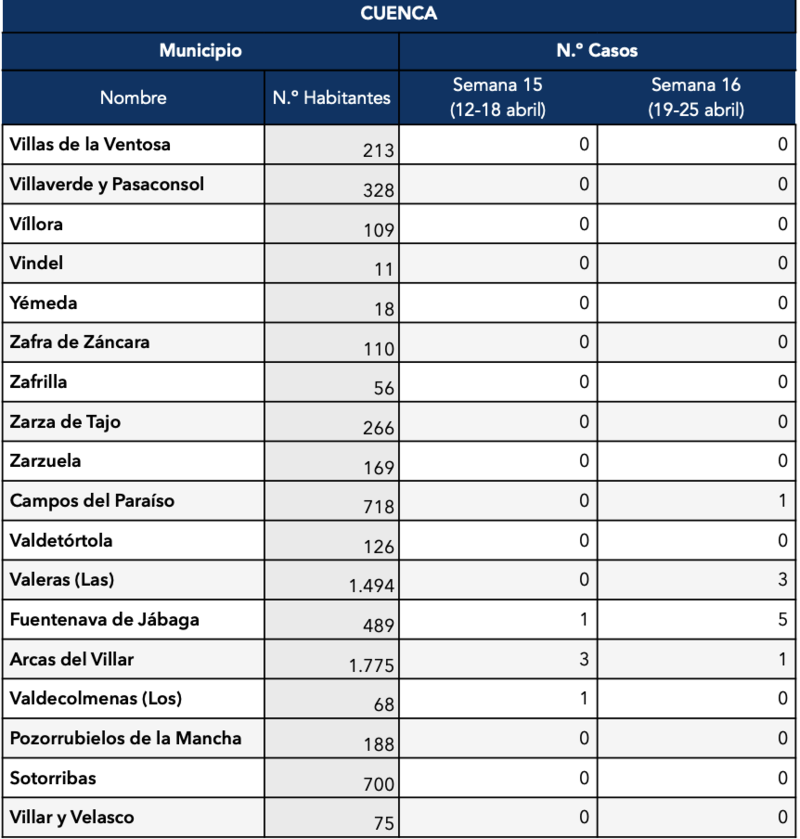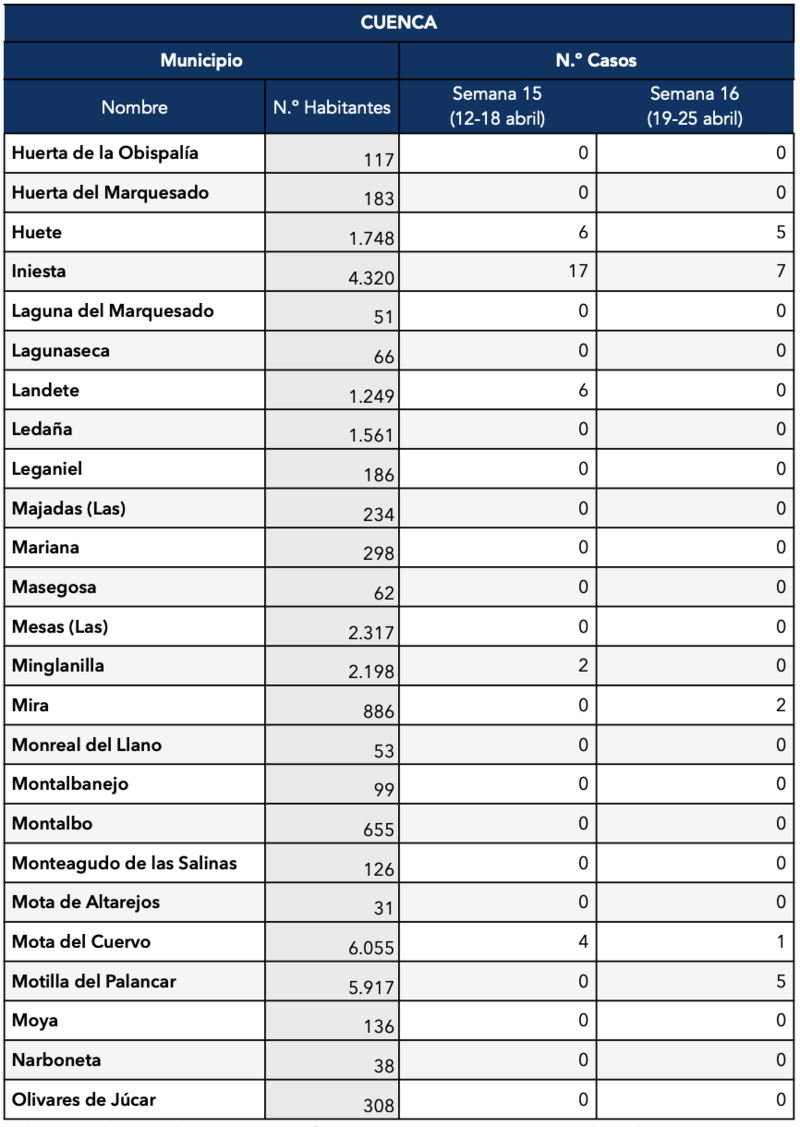 El Gobierno de Castilla-La Mancha, a través de la Dirección General de Salud Pública, ha confirmado que el municipio de Motilla del Palancar cuenta con 5 casos de coronavirus. Estos casos de Covid-19 corresponden a la semana epidemiológica 16 (del 19 al 25 de Abril).