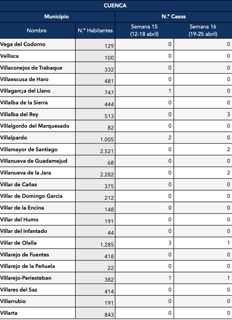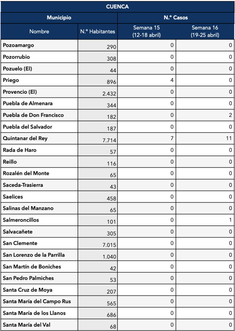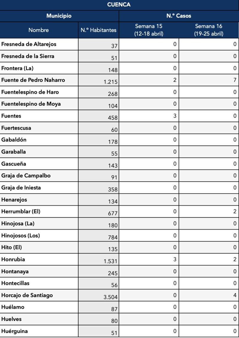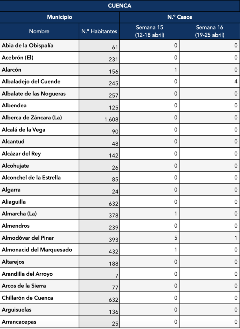 El Gobierno de Castilla-La Mancha, a través de la Dirección General de Salud Pública, ha confirmado que el municipio de Motilla del Palancar cuenta con 5 casos de coronavirus. Estos casos de Covid-19 corresponden a la semana epidemiológica 16 (del 19 al 25 de Abril).