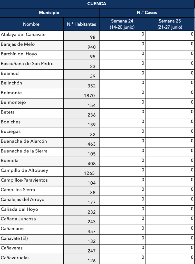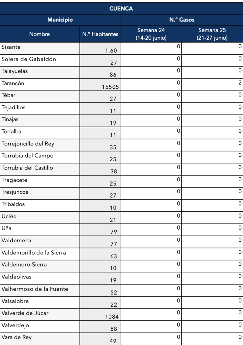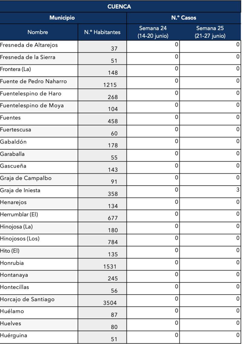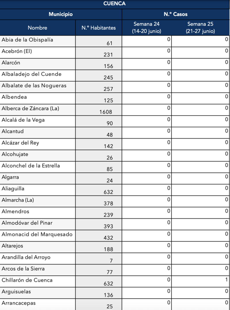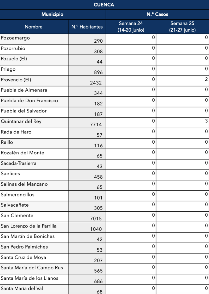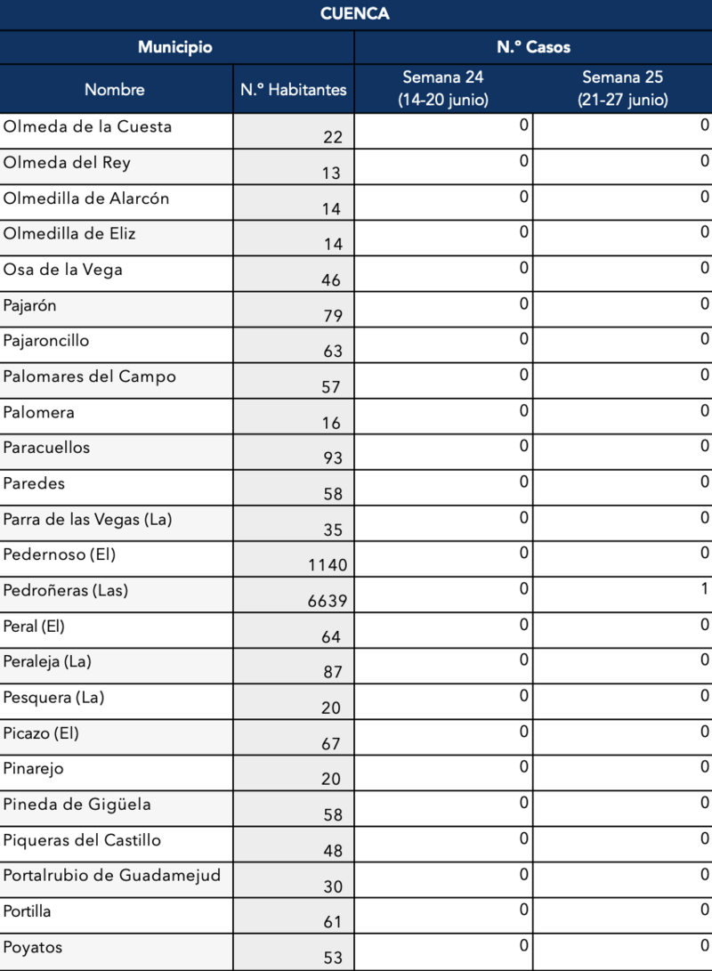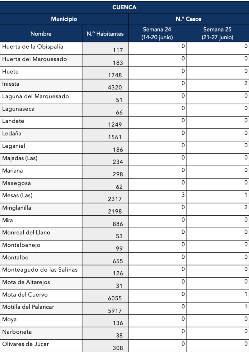 El Gobierno de Castilla-La Mancha, a través de la Dirección General de Salud Pública, ha confirmado que el municipio de Motilla del Palancar cuenta con 1 casos de coronavirus. Estos casos de Covid-19 corresponden a la semana epidemiológica 25 (del 21 al 27 de junio).