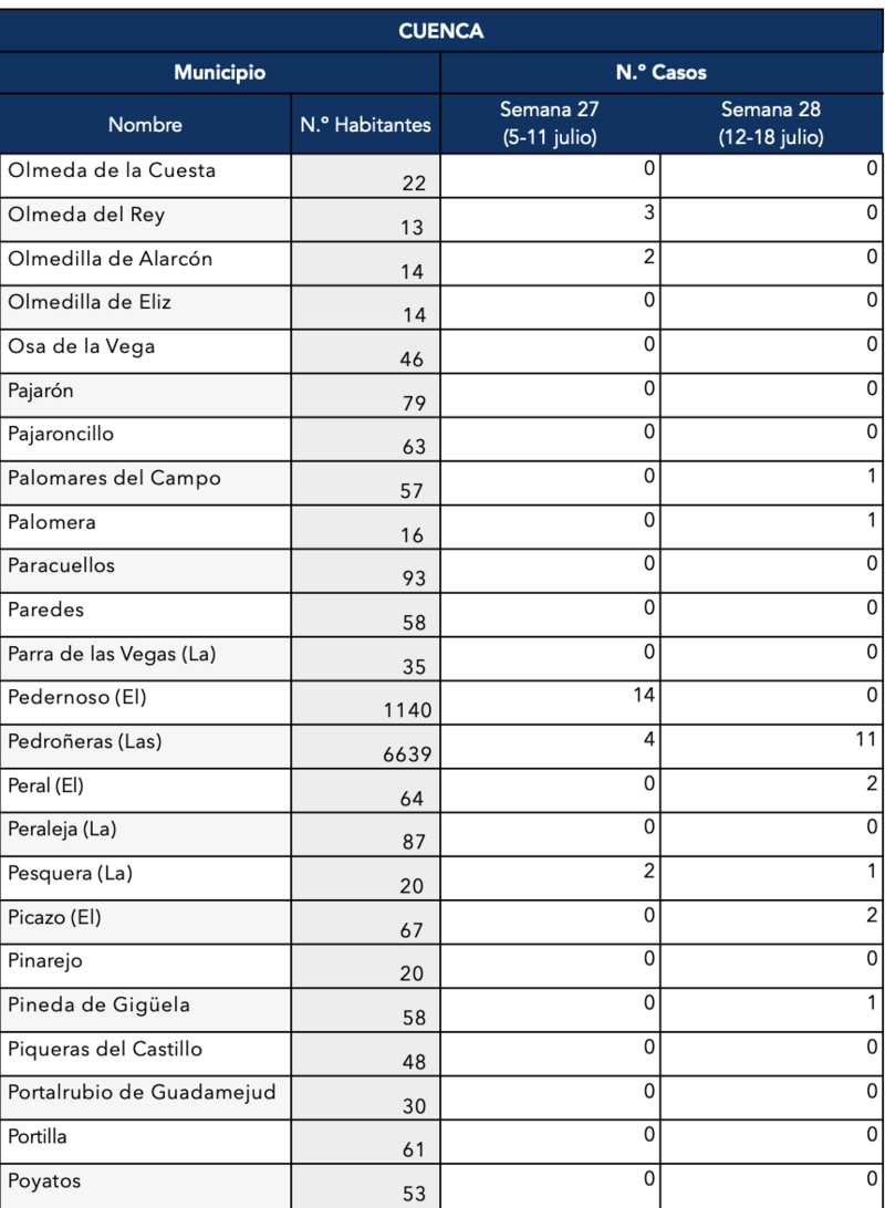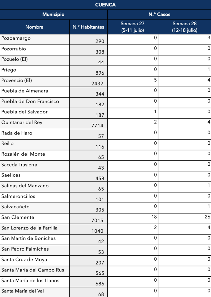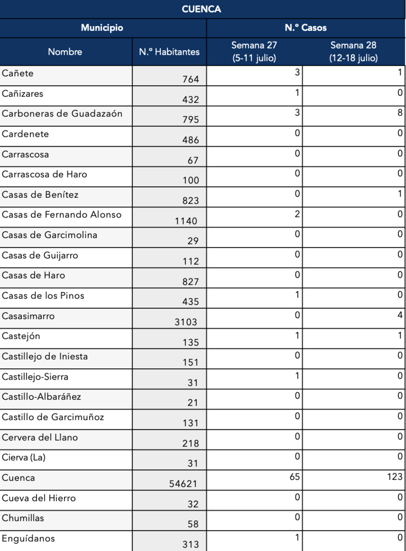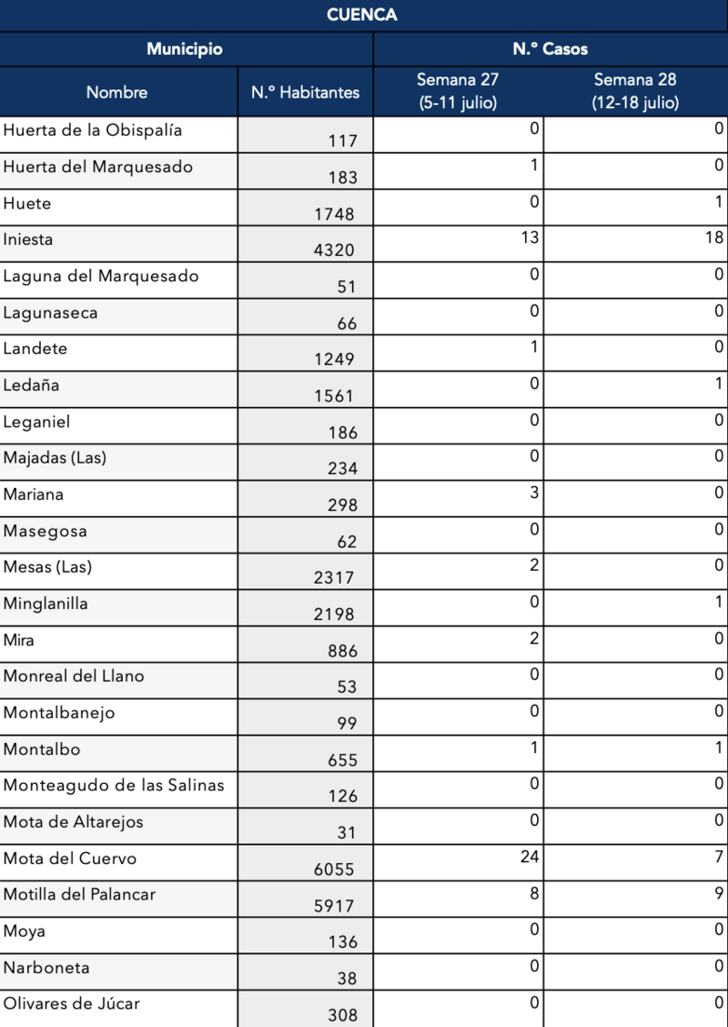 El Gobierno de Castilla-La Mancha, a través de la Dirección General de Salud Pública, ha confirmado que el municipio de Motilla del Palancar cuenta con 9 casos de coronavirus. Estos corresponden a la semana epidemiológica 28 (del 12 al 18 de julio). Uno más que la semana anterior.