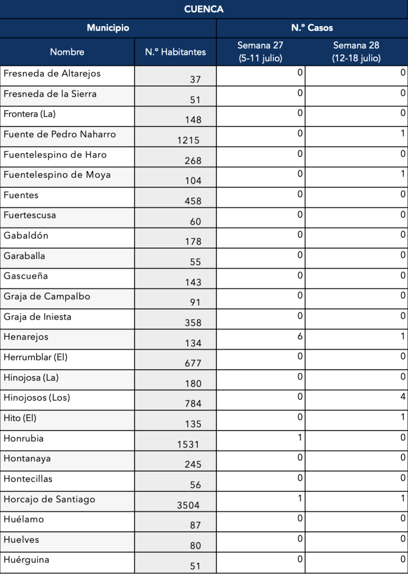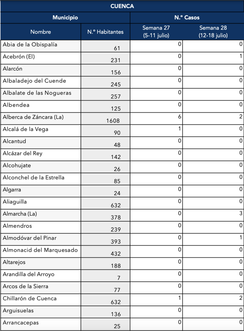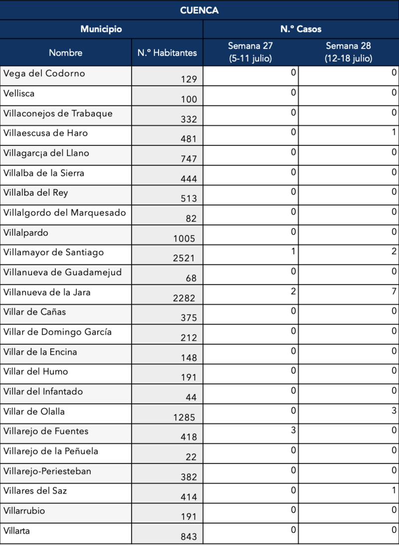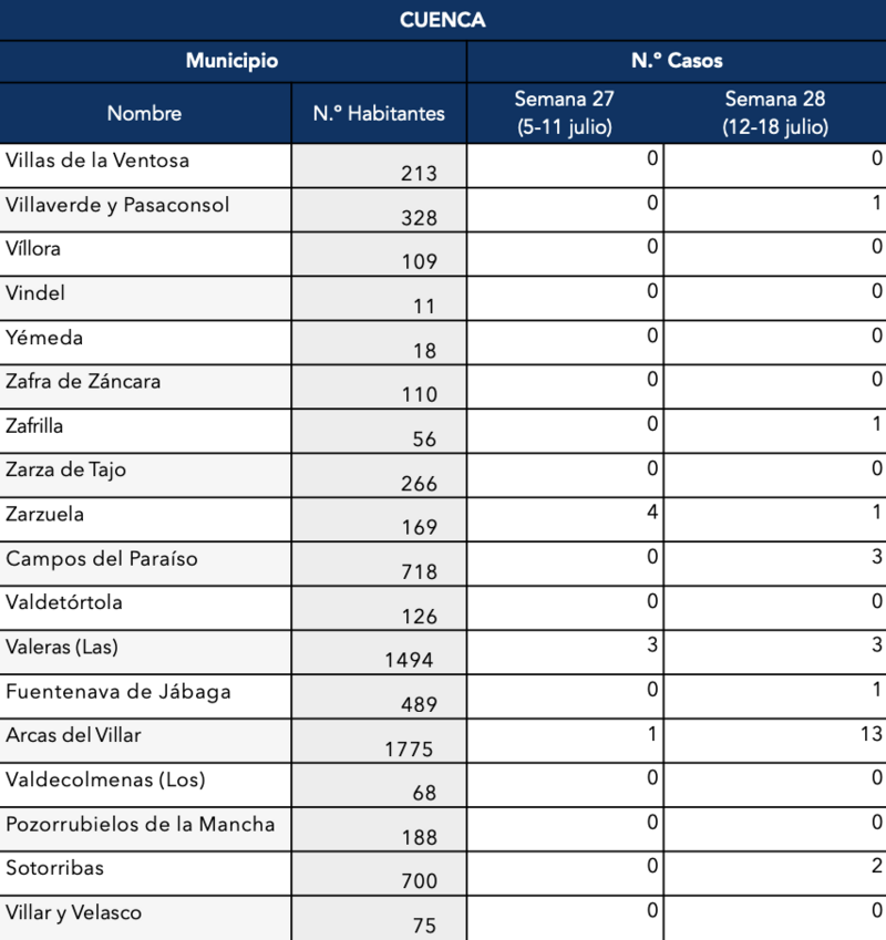 El Gobierno de Castilla-La Mancha, a través de la Dirección General de Salud Pública, ha confirmado que el municipio de Motilla del Palancar cuenta con 9 casos de coronavirus. Estos corresponden a la semana epidemiológica 28 (del 12 al 18 de julio). Uno más que la semana anterior.