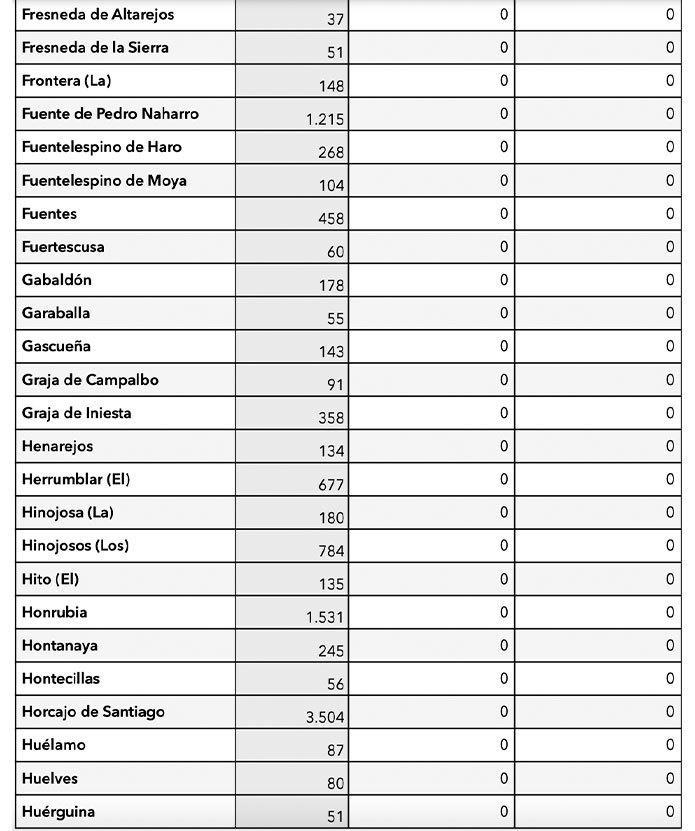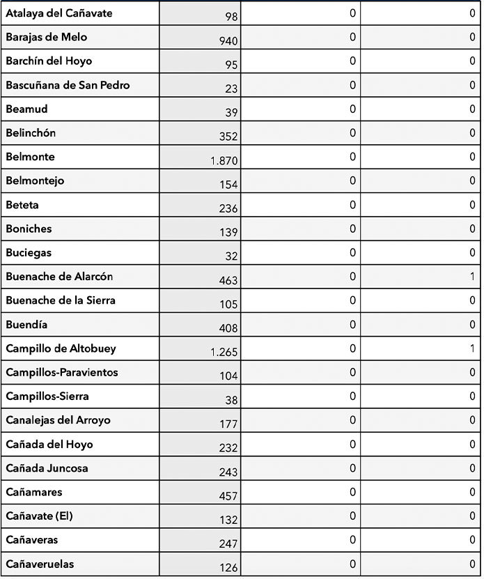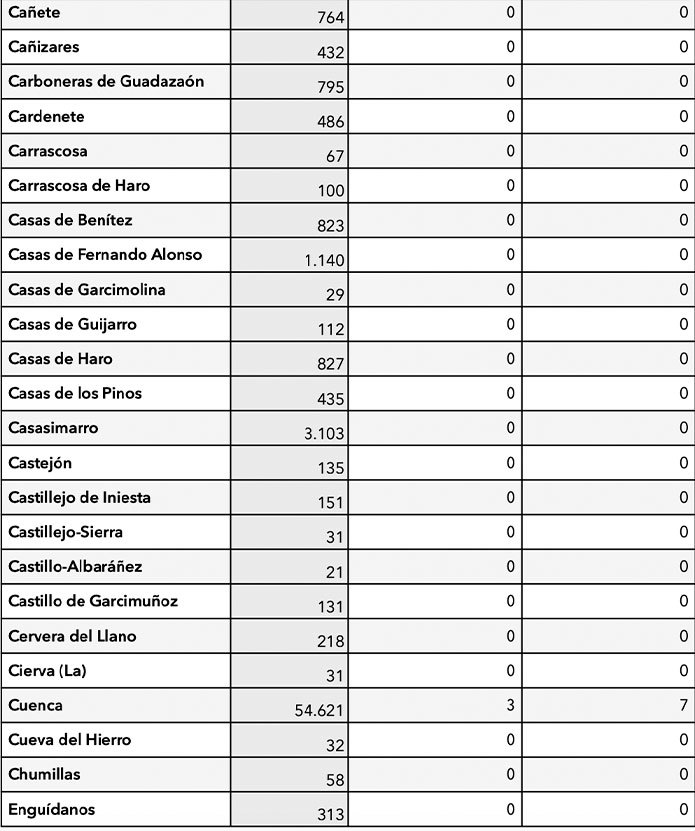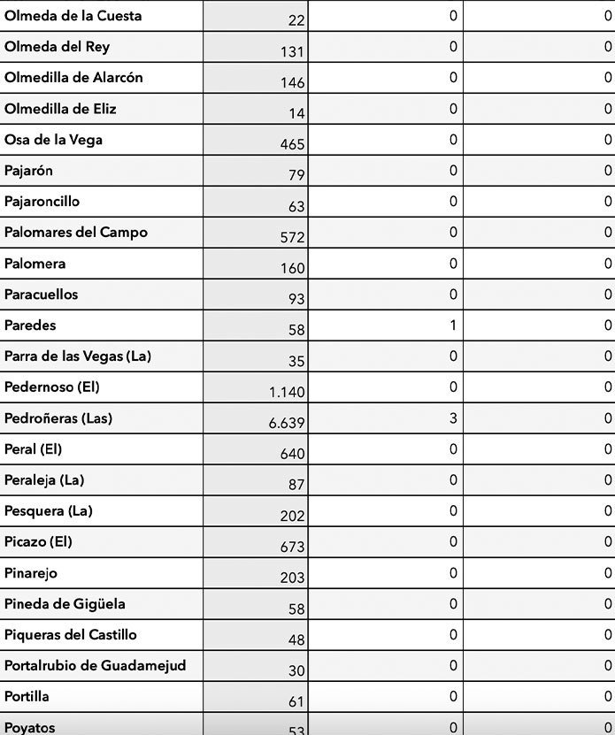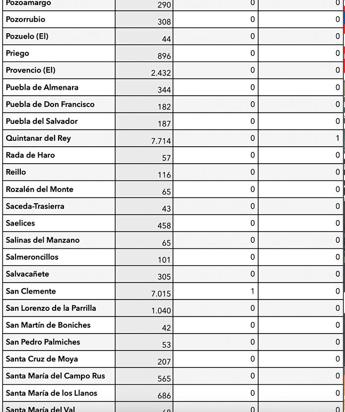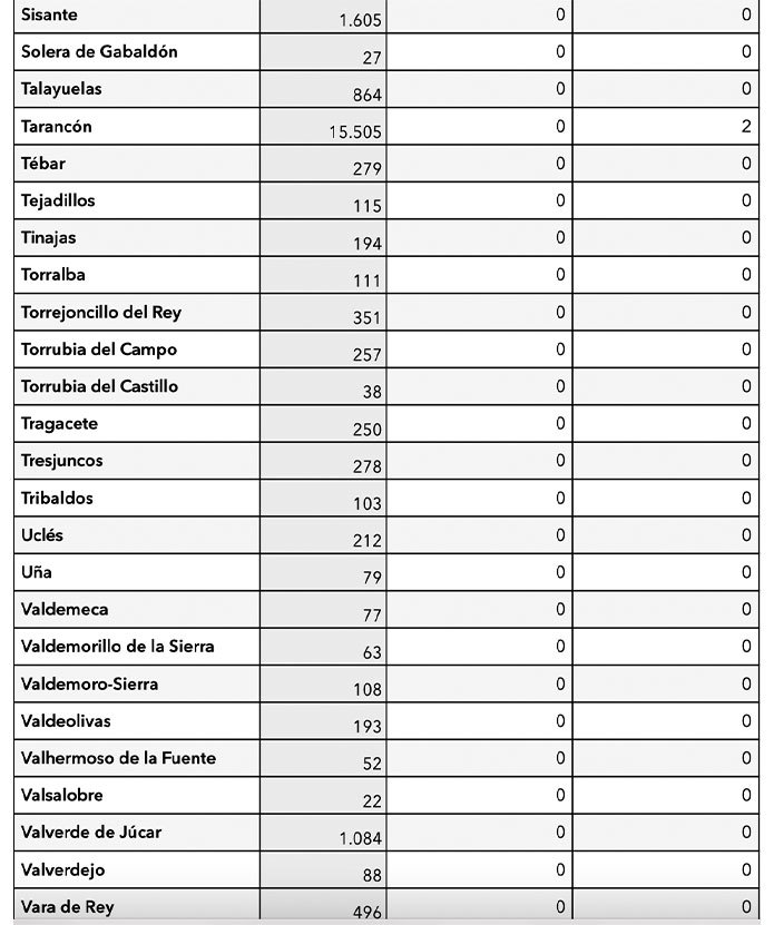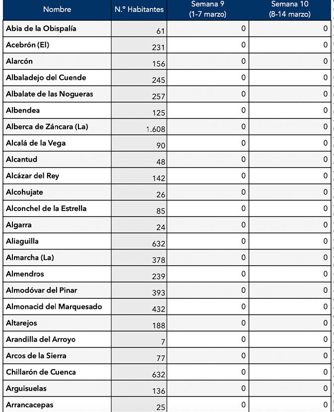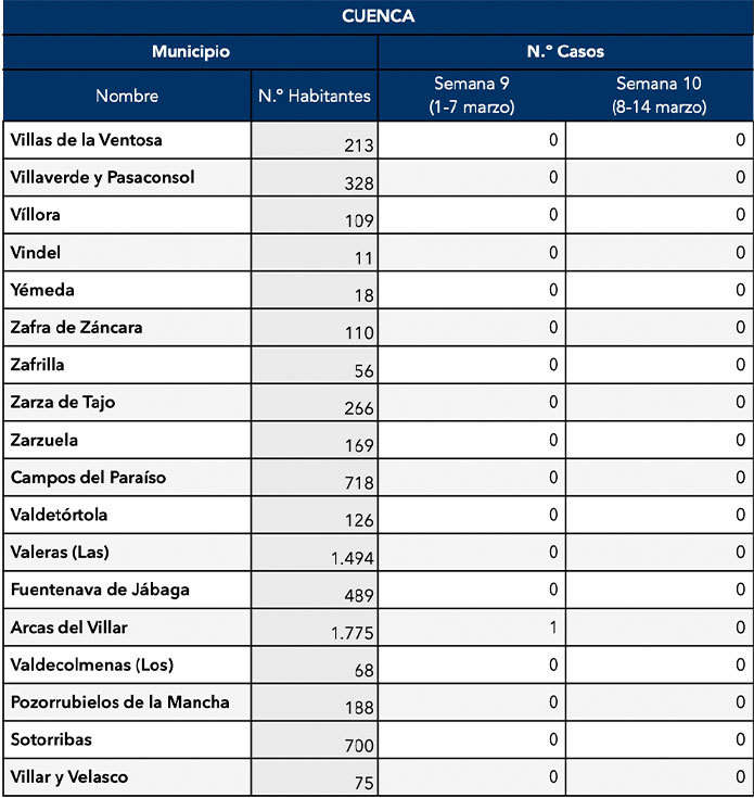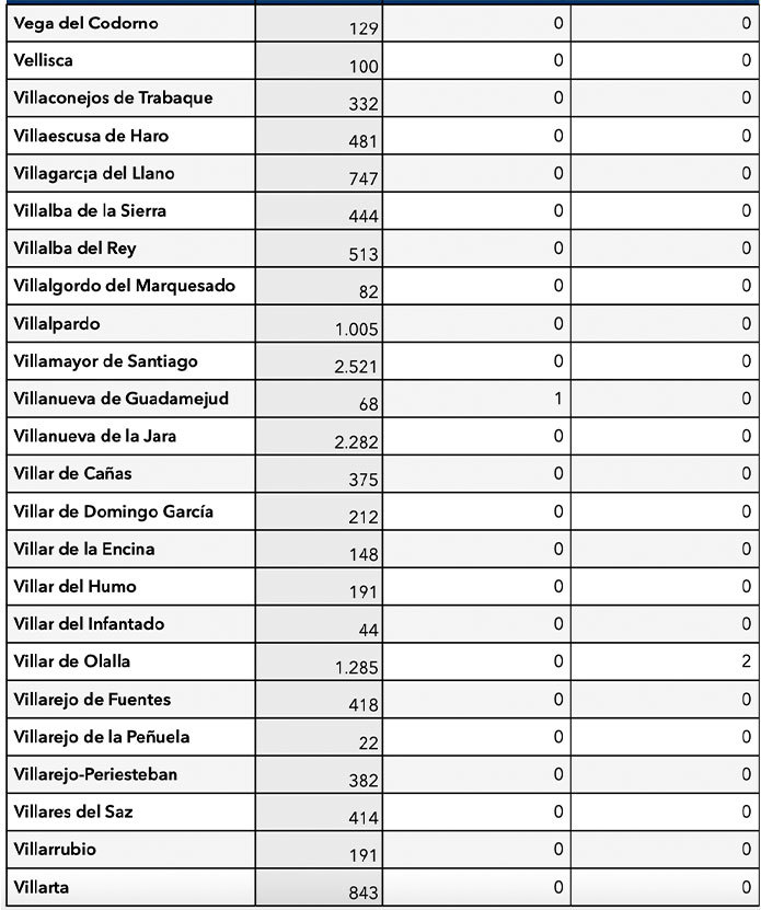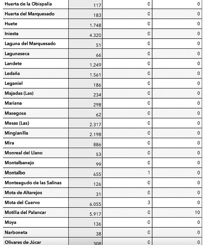 Los únicos municipios conquenses con positivos son Motilla del Palancar (10), Quintanar del Rey (1), Villar de Olalla (2) y Tarancon (2), Buenache de Alarcón (1) y Campillo de Altobuey (1).
