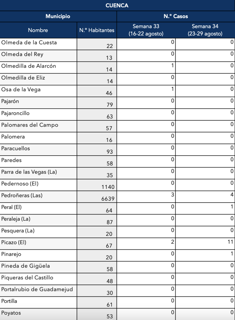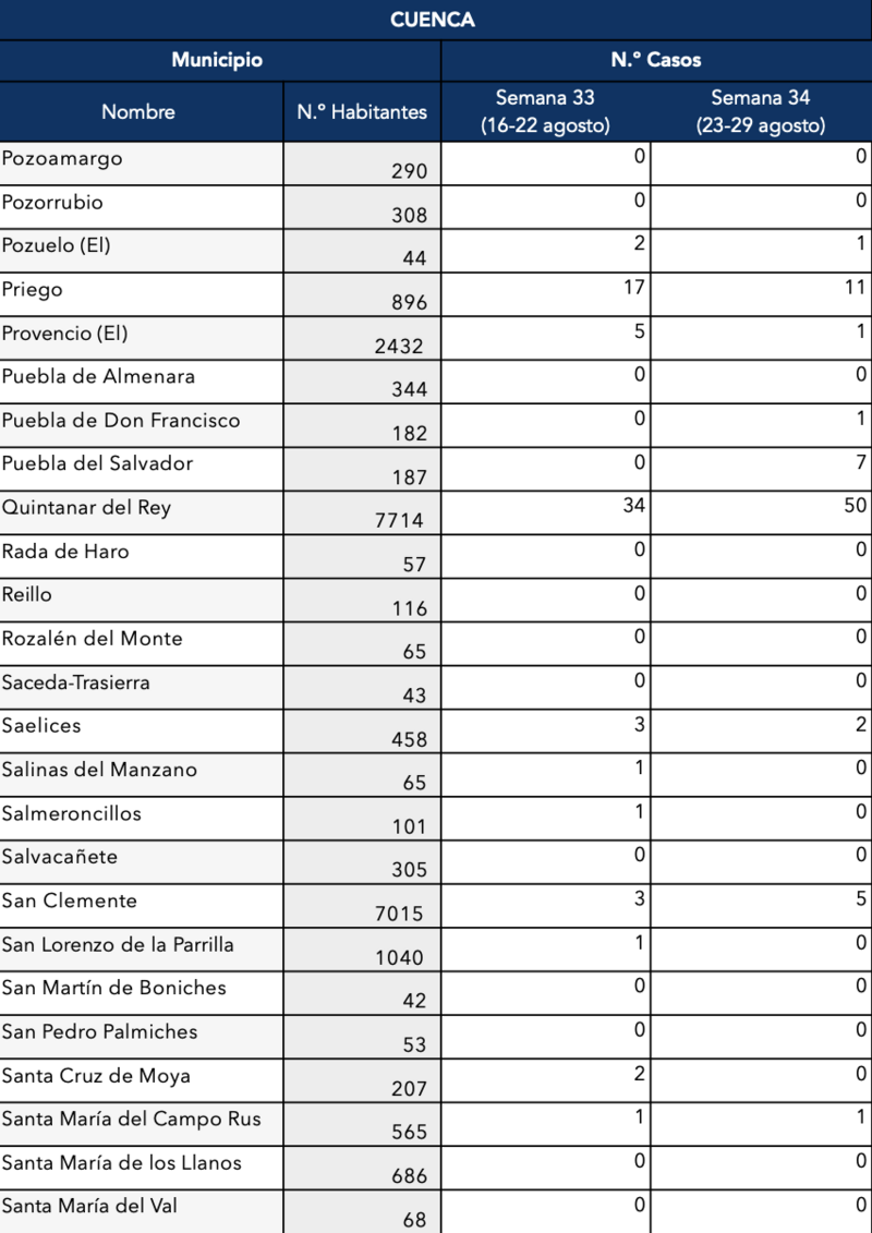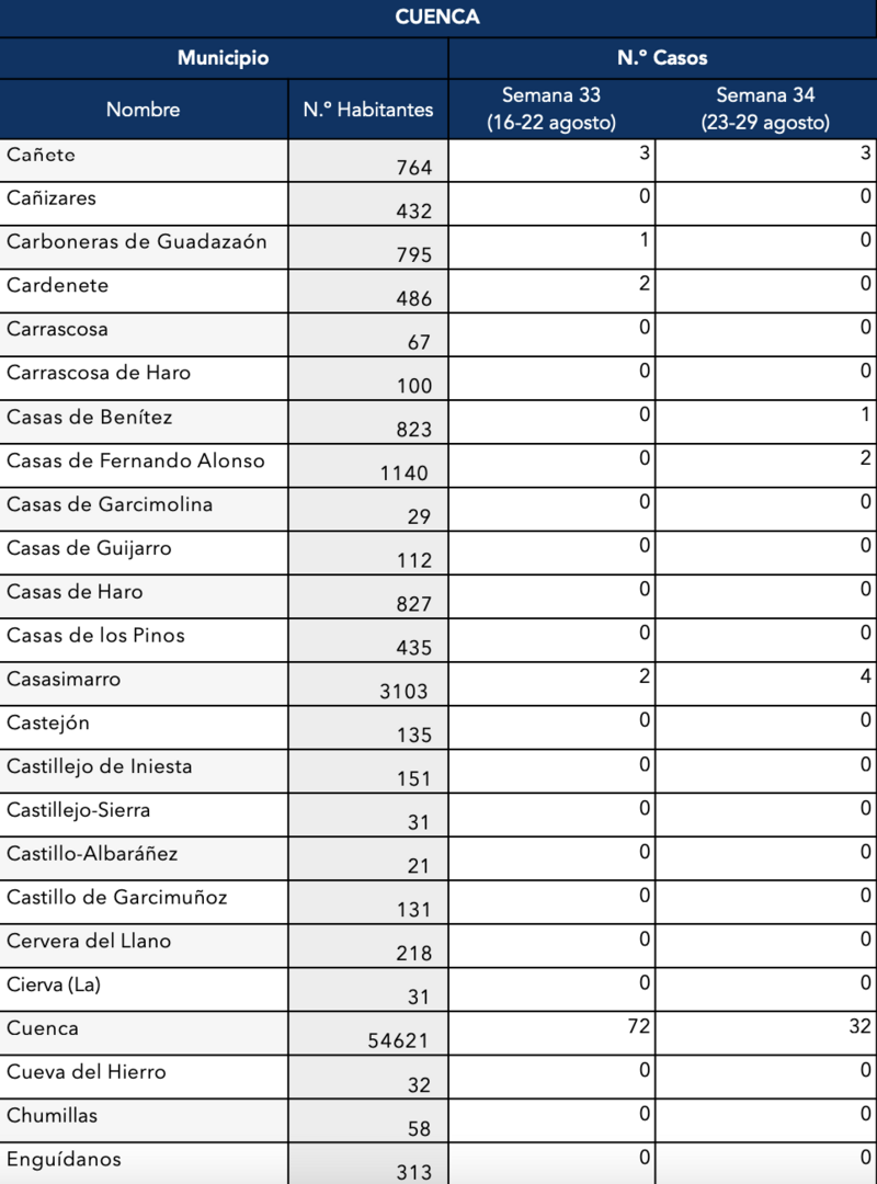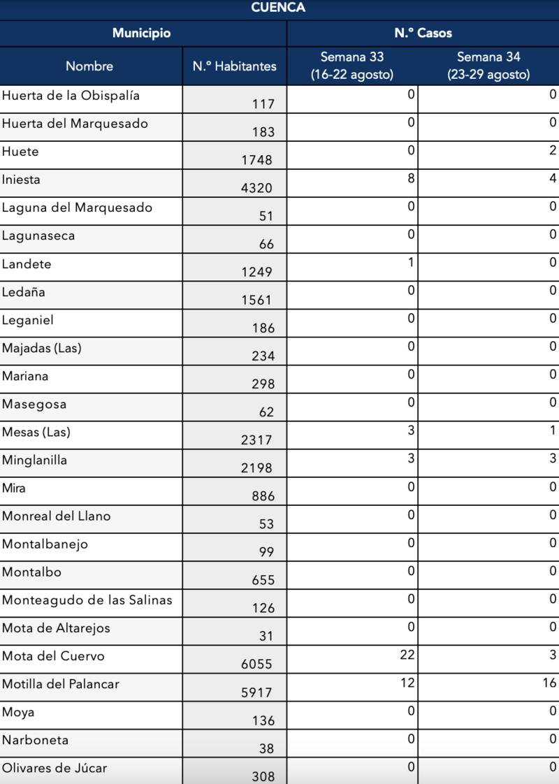 El Gobierno de Castilla-La Mancha, a través de la Dirección General de Salud Pública, ha confirmado que el municipio de Motilla del Palancar cuenta con 16 casos de coronavirus, un ligero aumento respecto a los 12 de la semana pasada. Estos corresponden a la semana epidemiológica 24 (del 23 al 29 de agosto).
