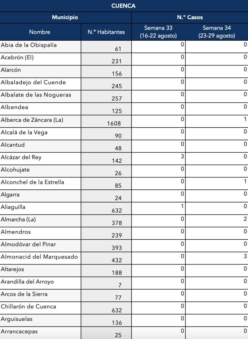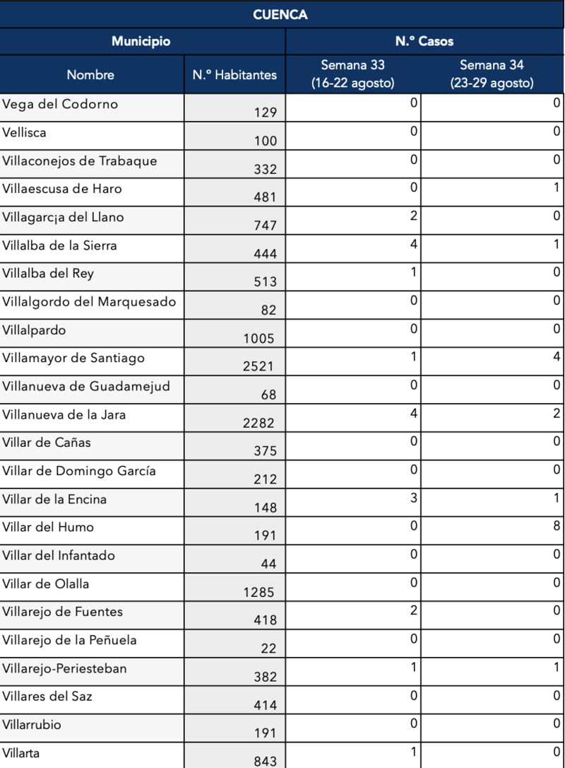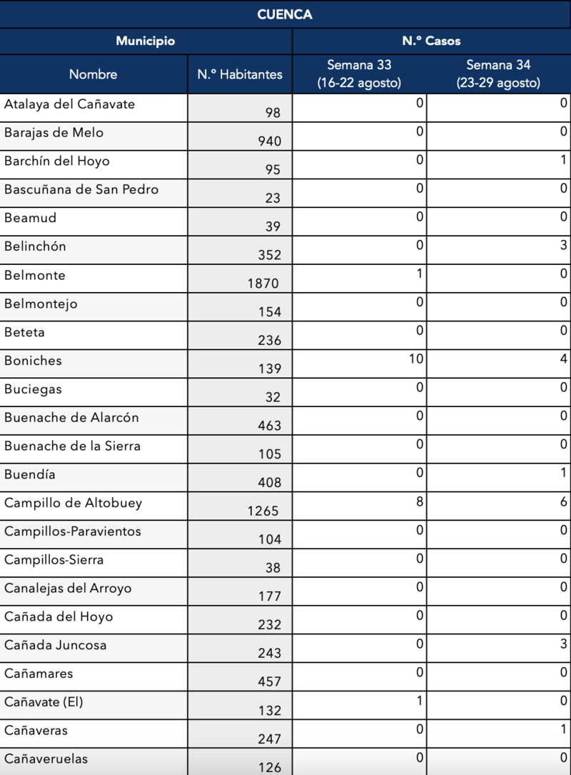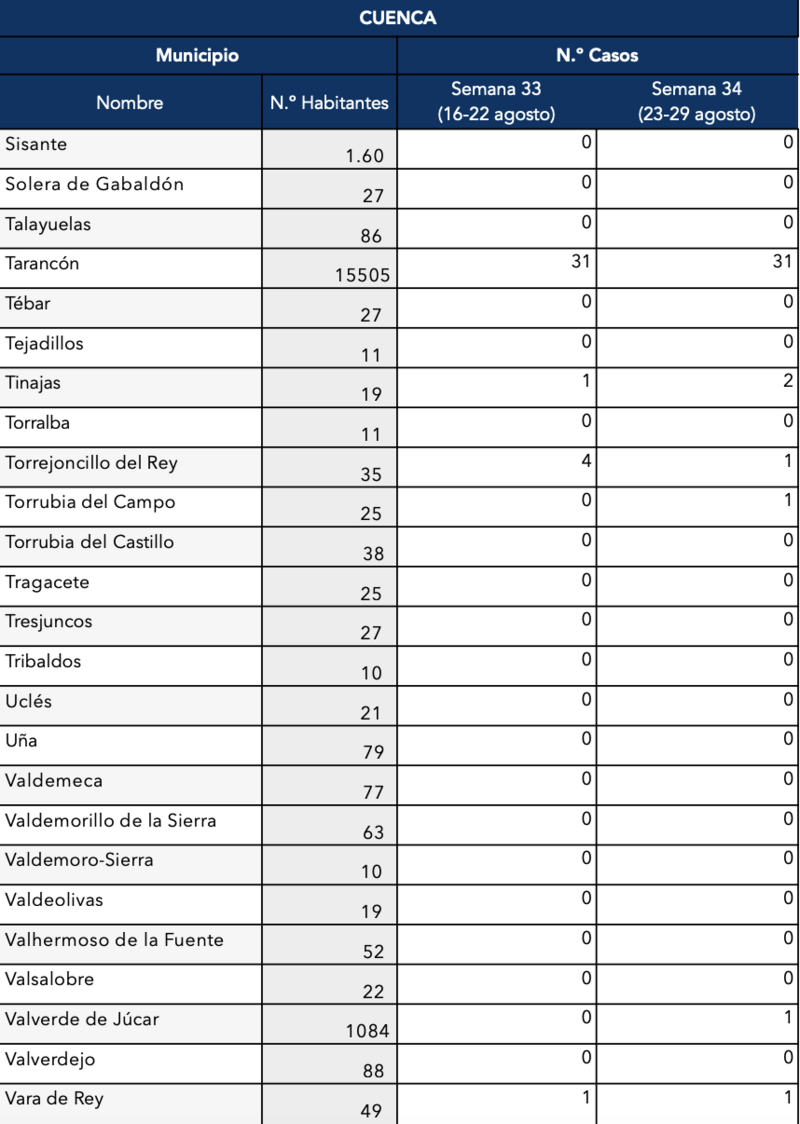 El Gobierno de Castilla-La Mancha, a través de la Dirección General de Salud Pública, ha confirmado que el municipio de Motilla del Palancar cuenta con 16 casos de coronavirus, un ligero aumento respecto a los 12 de la semana pasada. Estos corresponden a la semana epidemiológica 24 (del 23 al 29 de agosto).