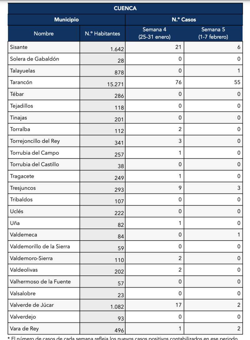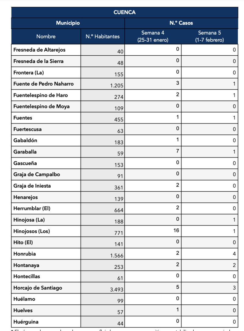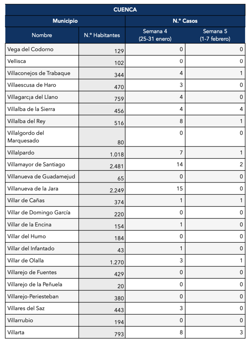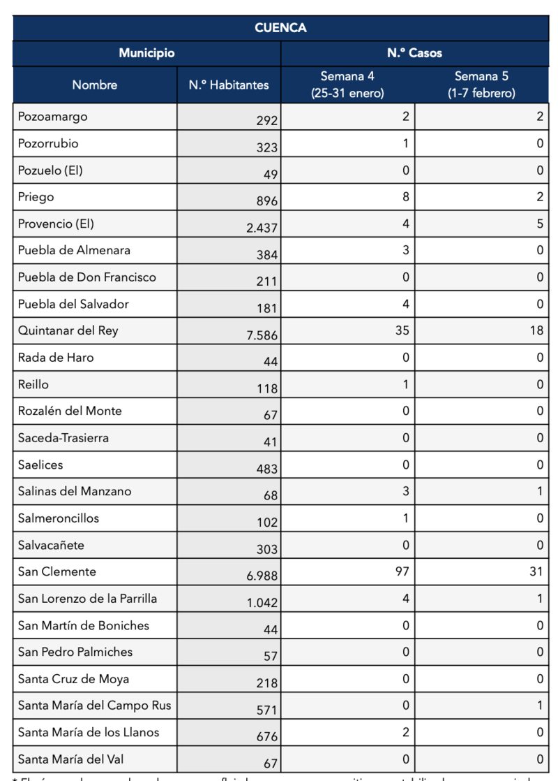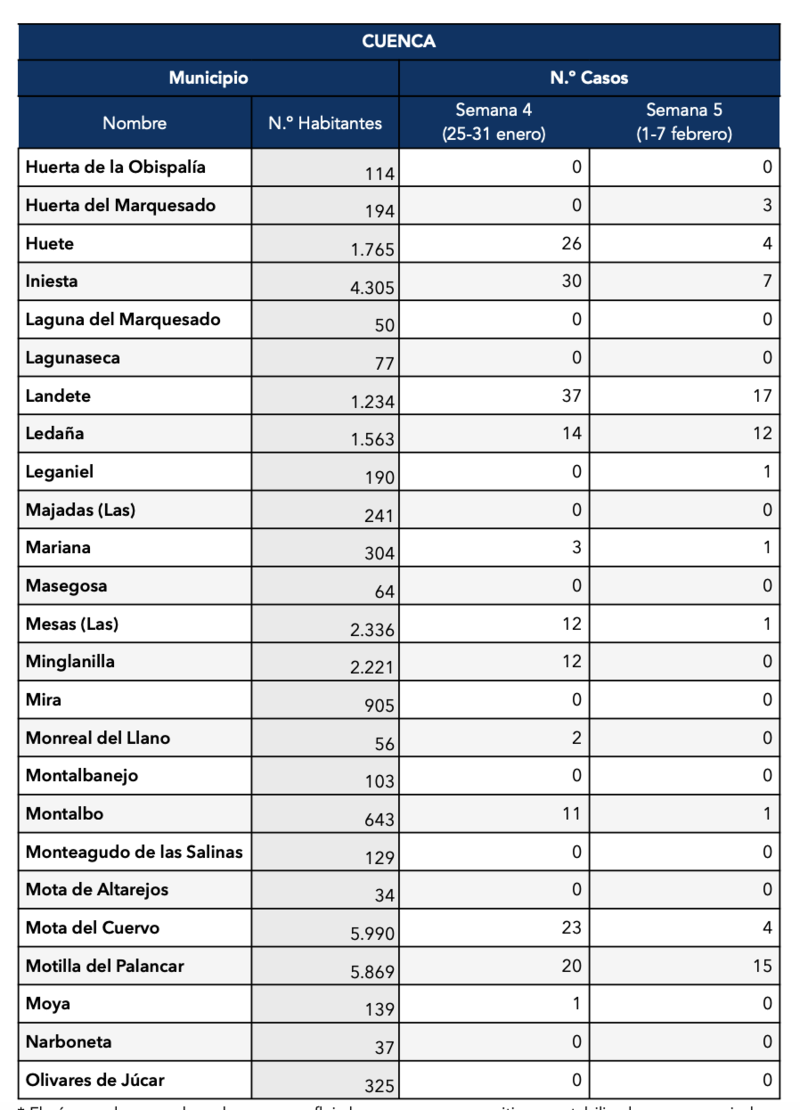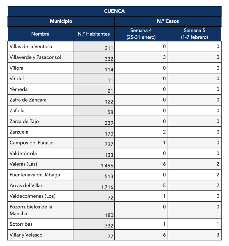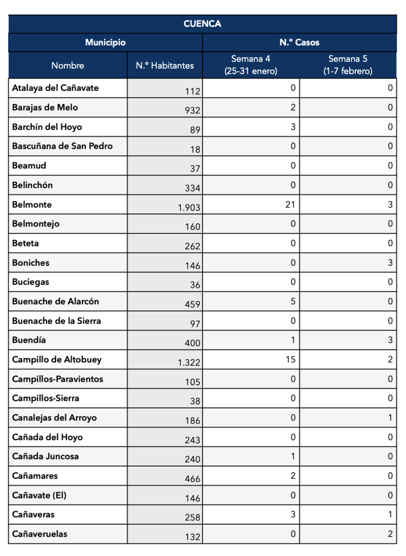 El Gobierno de Castilla-La Mancha, a través de la Dirección General de Salud Pública, ha confirmado 15 nuevos casos en el municipio de Motilla del Palancar. Estos casos de Covid-19 corresponden a la semana epidemiológica 5 (del 1 al 7 de Febrero)