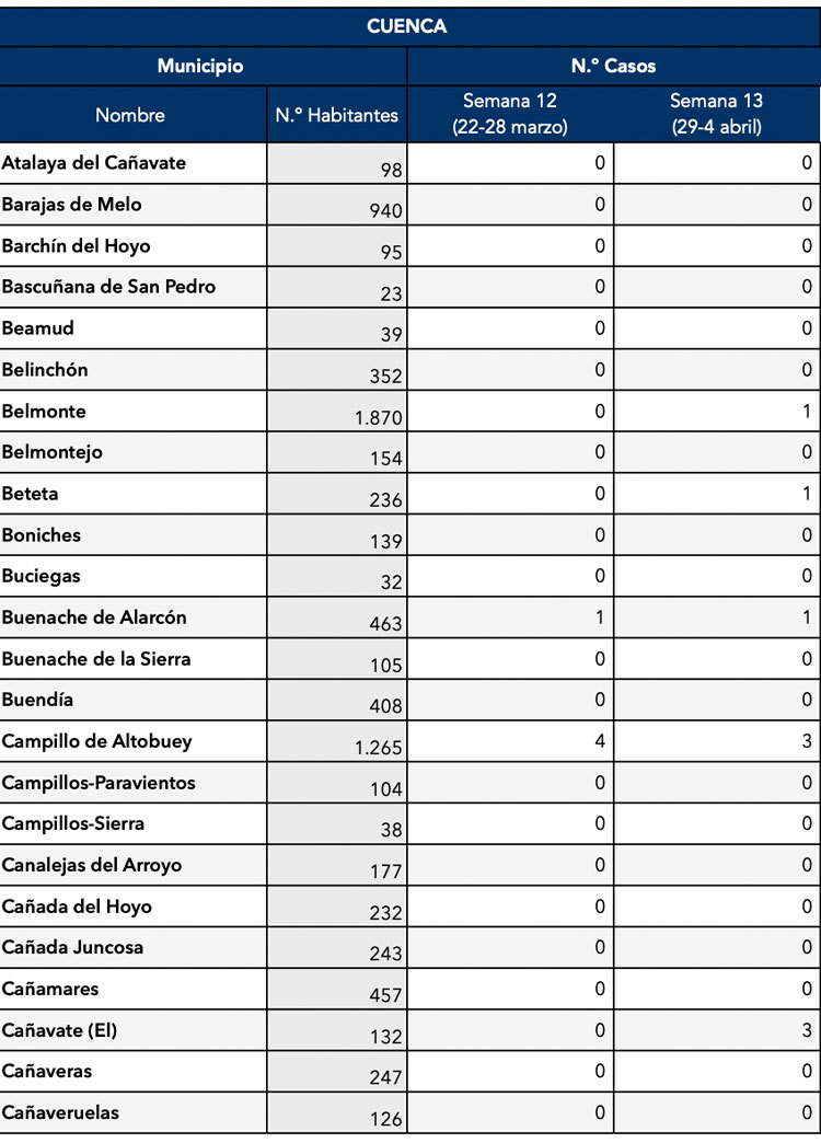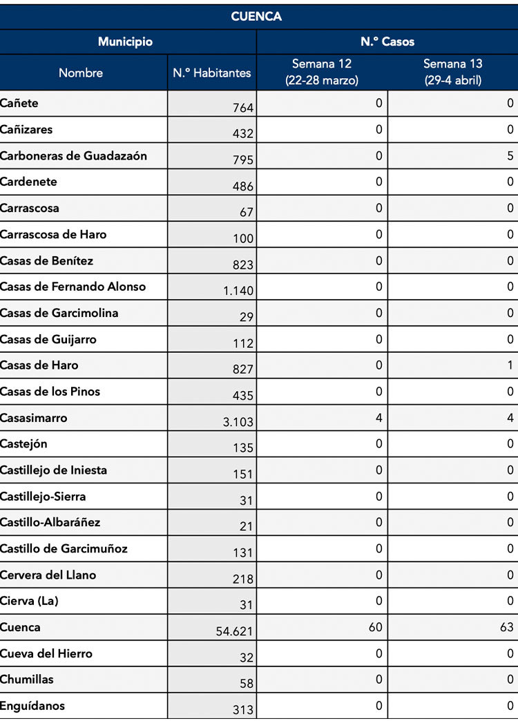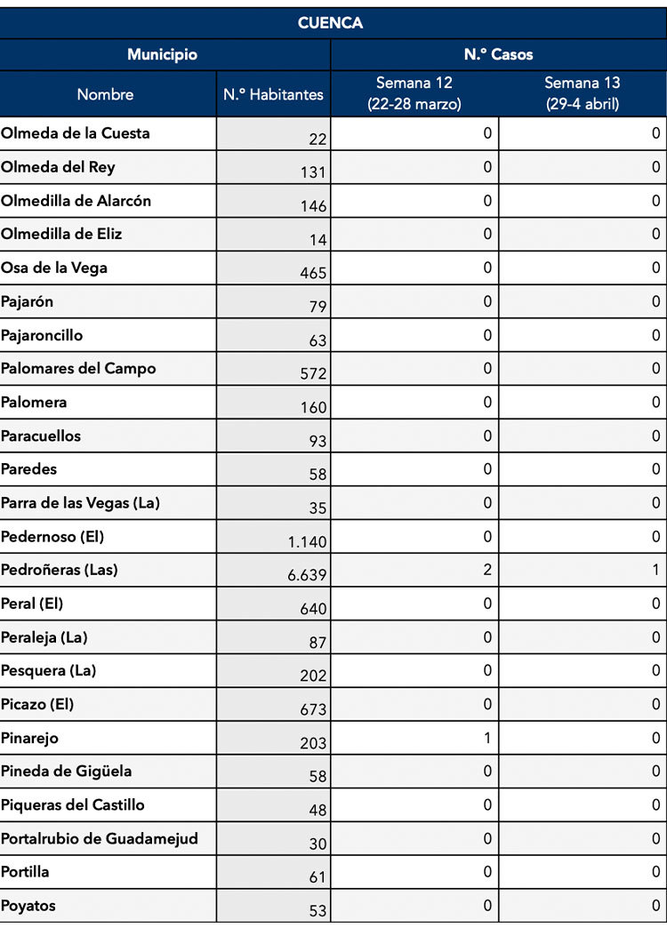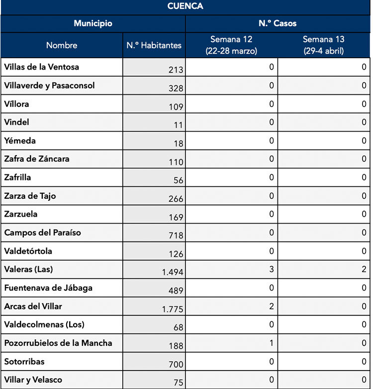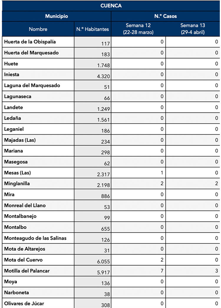 El Gobierno de Castilla-La Mancha, a través de la Dirección General de Salud Pública, ha confirmado que el municipio de Motilla del Palancar cuenta con 3 casos de coronavirus. Estos casos de Covid-19 corresponden a la semana epidemiológica 13 (del 29 al 4 de Abril).