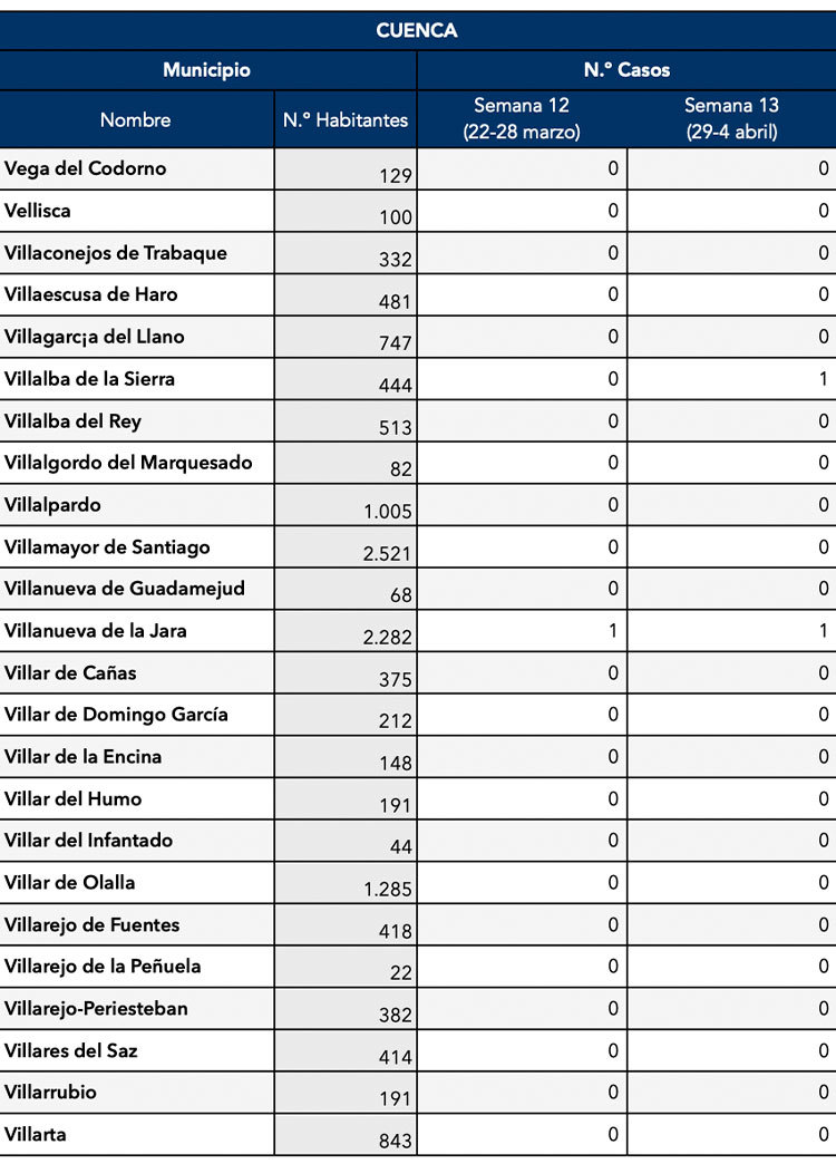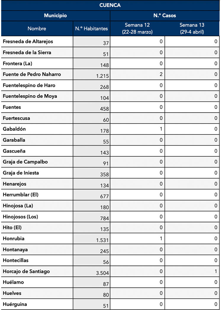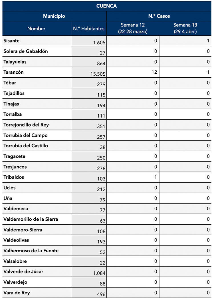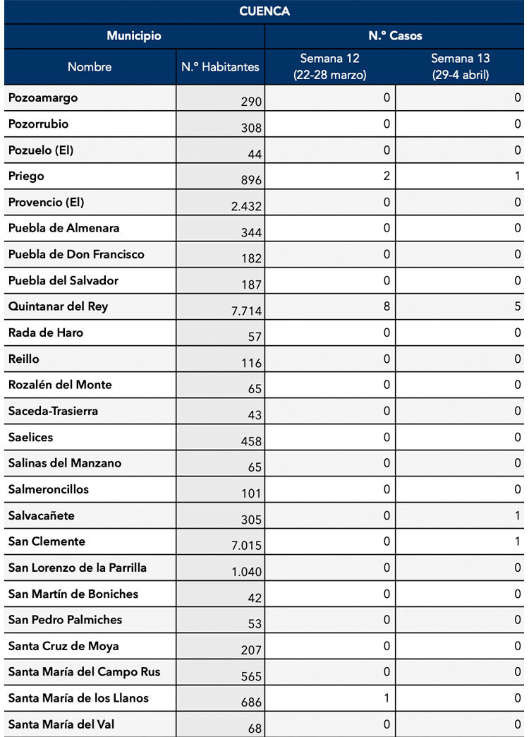 El Gobierno de Castilla-La Mancha, a través de la Dirección General de Salud Pública, ha confirmado que el municipio de Motilla del Palancar cuenta con 3 casos de coronavirus. Estos casos de Covid-19 corresponden a la semana epidemiológica 13 (del 29 al 4 de Abril).