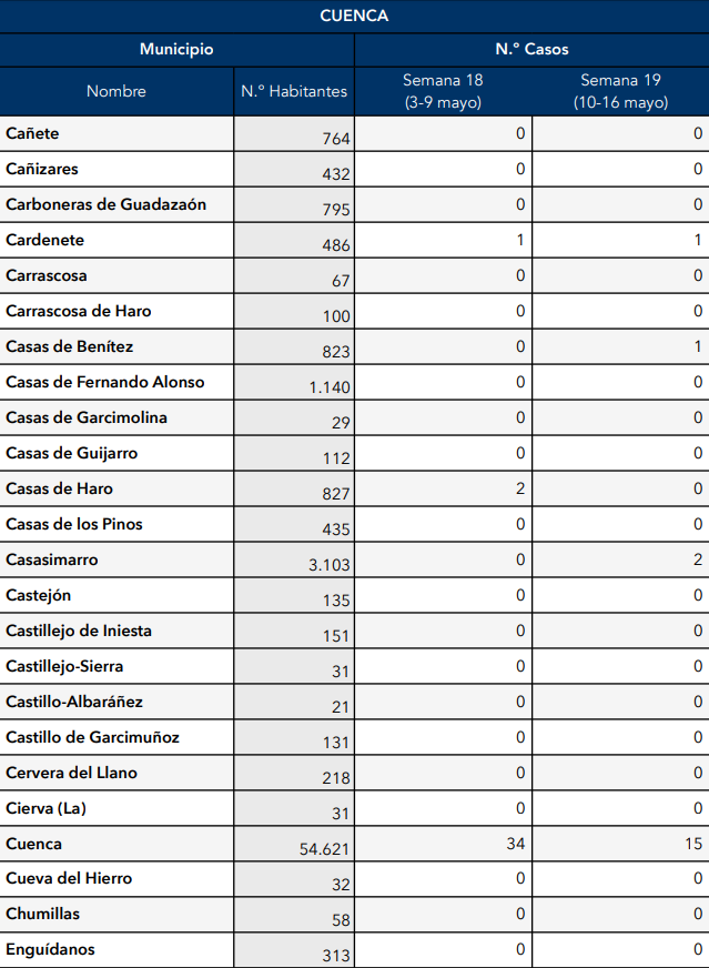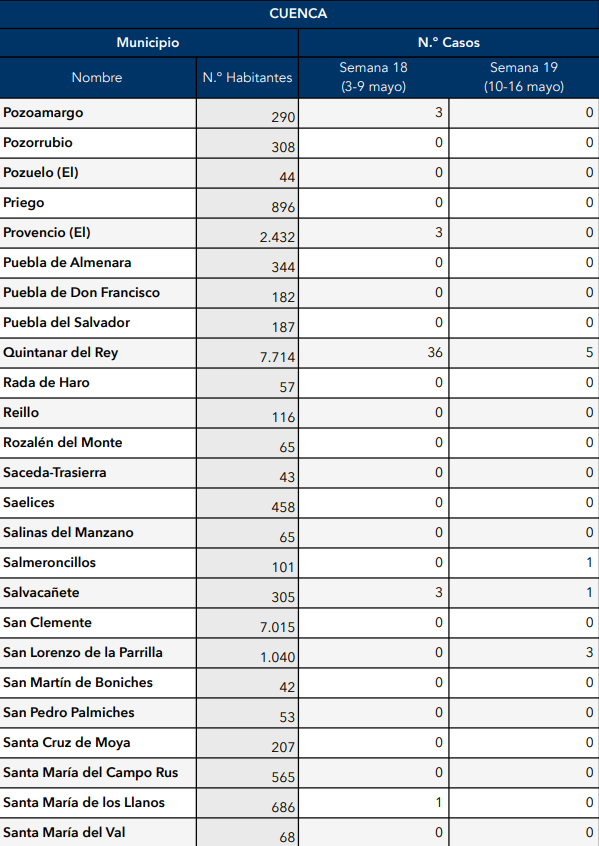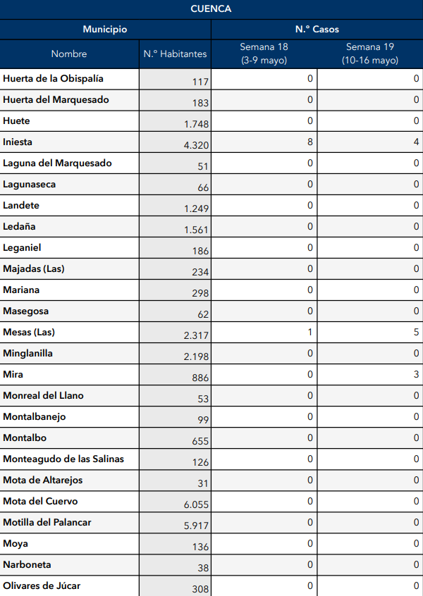 El Gobierno de Castilla-La Mancha, a través de la Dirección General de Salud Pública, ha confirmado que el municipio de Motilla del Palancar cuenta con 0 casos de coronavirus. Estos casos de Covid-19 corresponden a la semana epidemiológica 19 (del 10 al 16 de mayo).