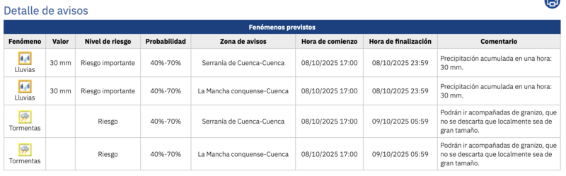 La Agencia Estatal de Meteorología (AEMET) ha emitido una alerta naranja por fuertes lluvias en Cuenca, con especial incidencia en La Mancha conquense y la Serranía, donde se prevén precipitaciones de hasta 30 mm en una hora. Ante esta situación, el Gobierno de Castilla-La Mancha ha activado el Plan METEOCAM en fase de alerta para las provincias de Cuenca y Albacete, debido al riesgo de lluvias y tormentas localmente intensas.