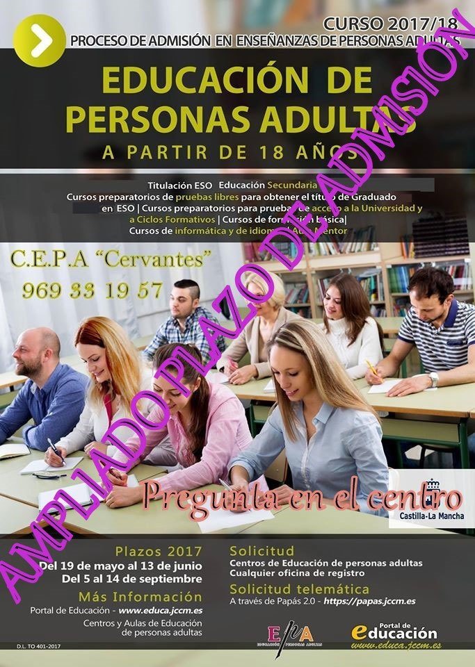 El Ayuntamiento de Motilla del Palancar ha comunicado que se amplía el plazo de matricula en C.E.P.A CERVANTES.