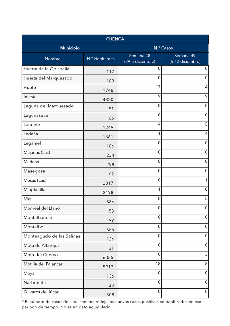 *Imagen de los últimos datos de Sanidad correspondientes a la semana epidimiológia 49 (Del 6 al 12 de Diciembre) en Iniesta.