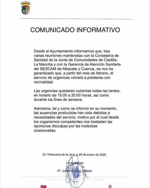 El Ayuntamiento de Villanueva de la Jara ha informado de que, a partir del próximo mes de febrero, el servicio de urgencias volverá a prestarse con normalidad en el municipio. Esta decisión llega tras las gestiones realizadas con la Consejería de Sanidad de la Junta de Comunidades de Castilla-La Mancha y con la Gerencia de Atención Sanitaria del SESCAM de Albacete y Cuenca.