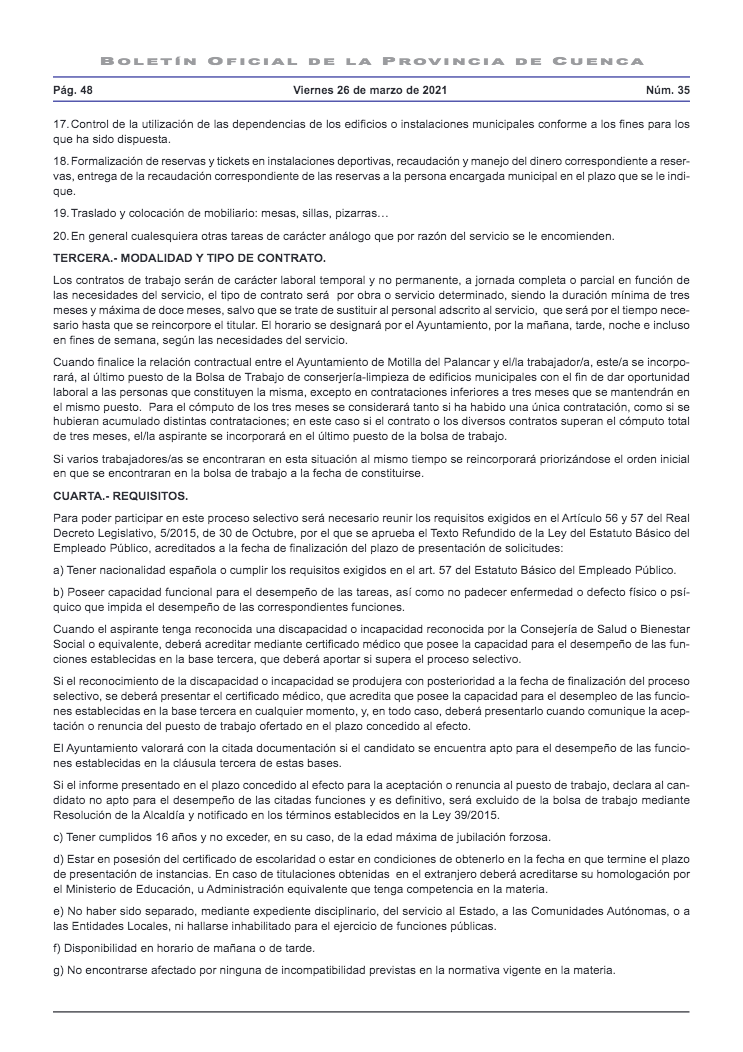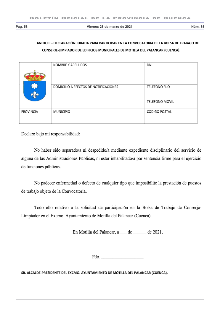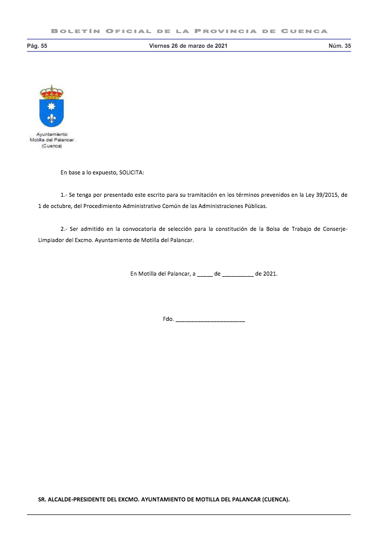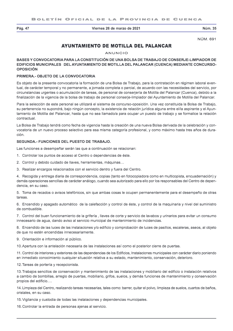 El Ayuntamiento de Motilla del Palancar ha comunicado mediante su página web la constitución de una Bolsa de trabajo de conserje-limpiador de edificios municipales.