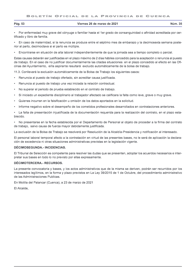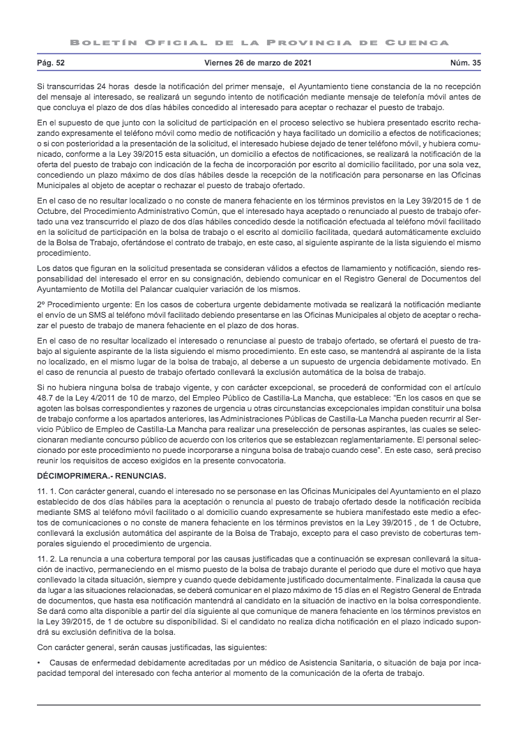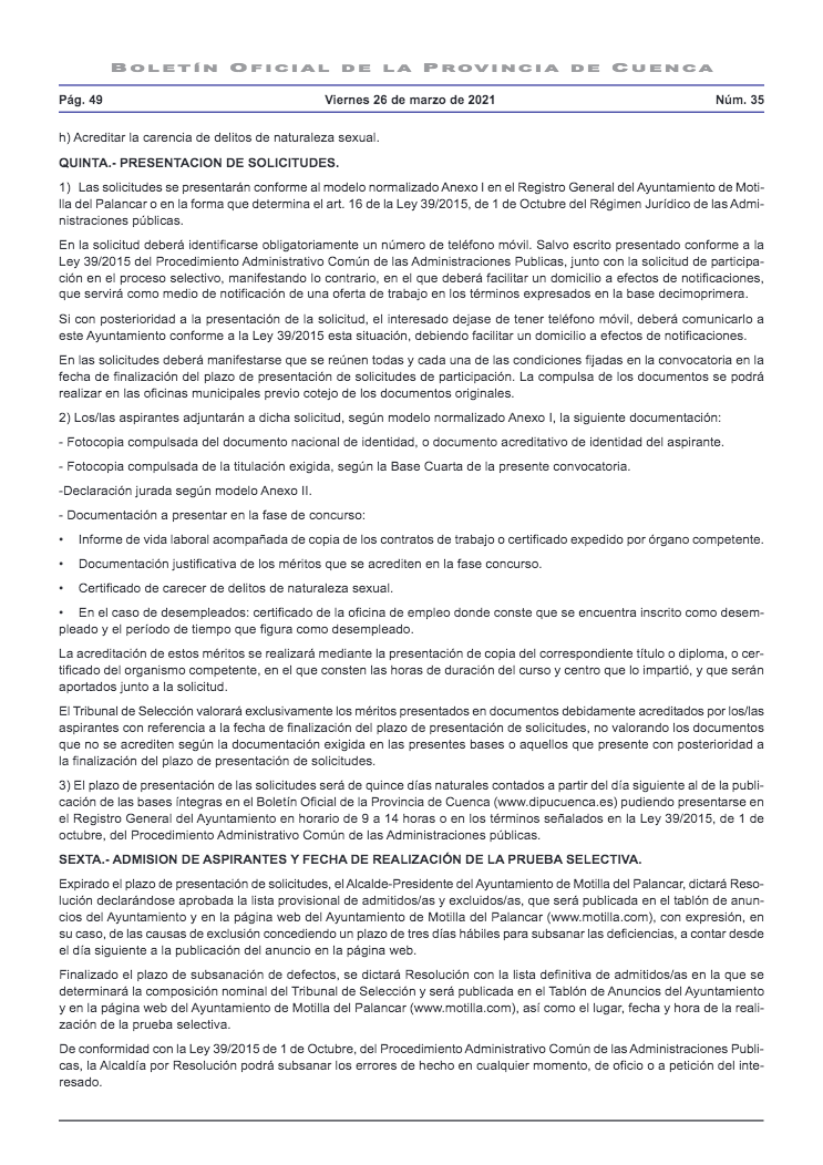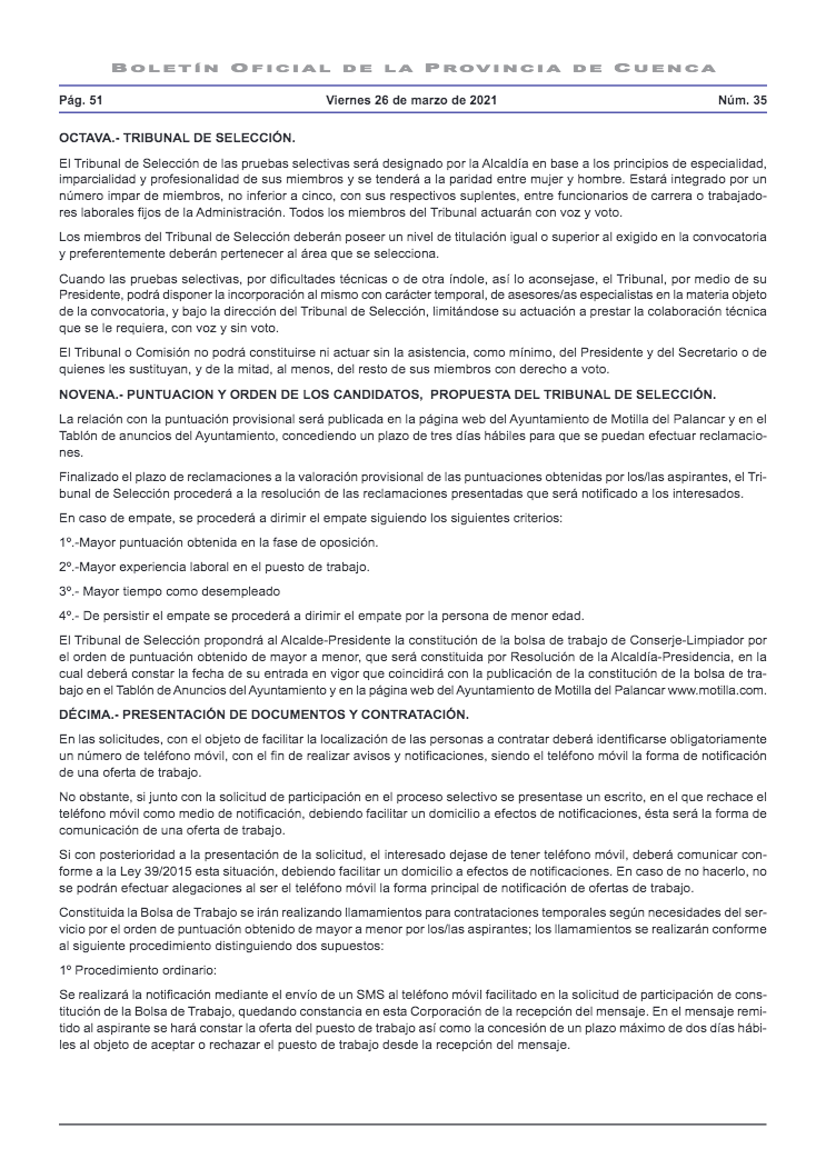 El Ayuntamiento de Motilla del Palancar ha comunicado mediante su página web la constitución de una Bolsa de trabajo de conserje-limpiador de edificios municipales.