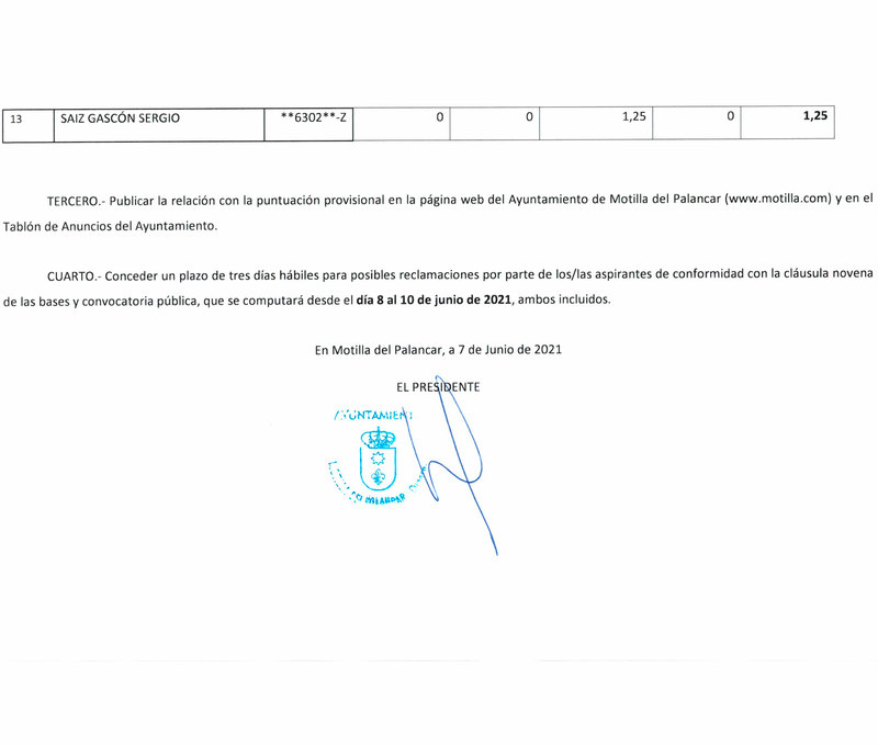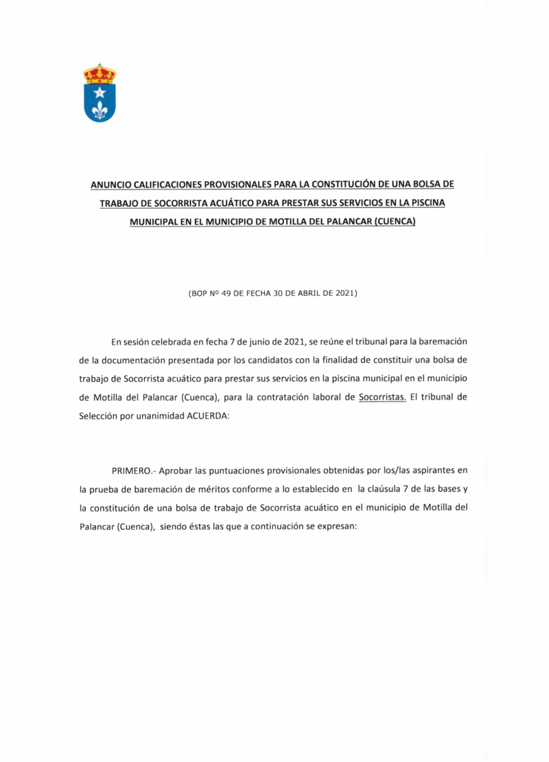 El Ayuntamiento de Motilla del Palancar ha publicado las calificaciones provisionales bolsa socorrista para la Piscina Municipal durante este verano del año 2021. Consulta todas las calificaciones en el siguiente bando.
