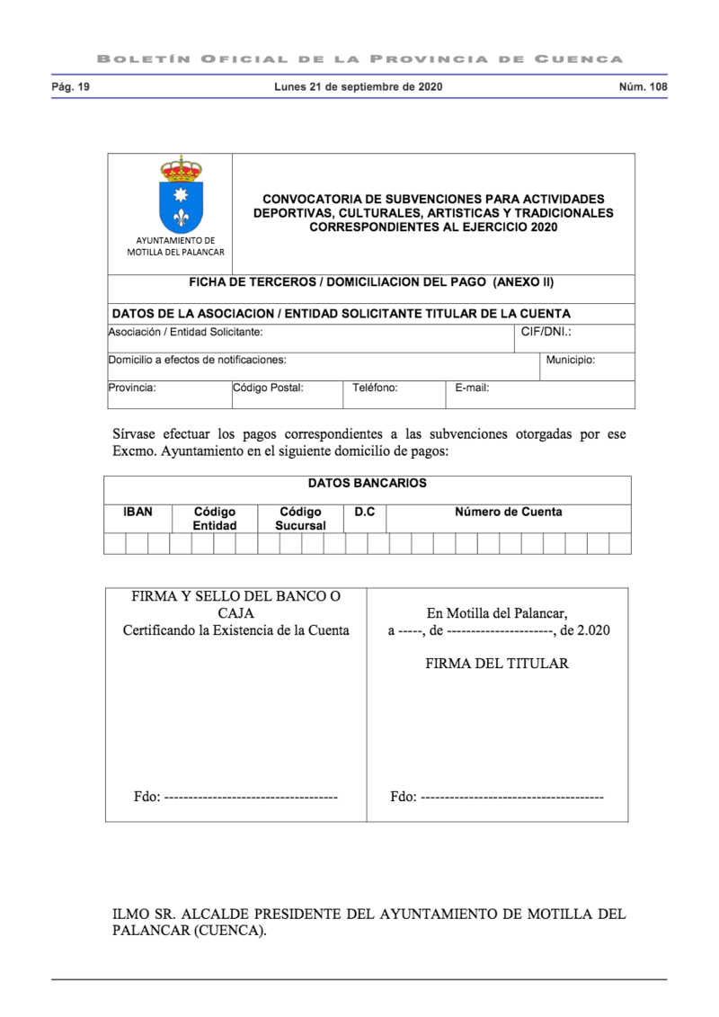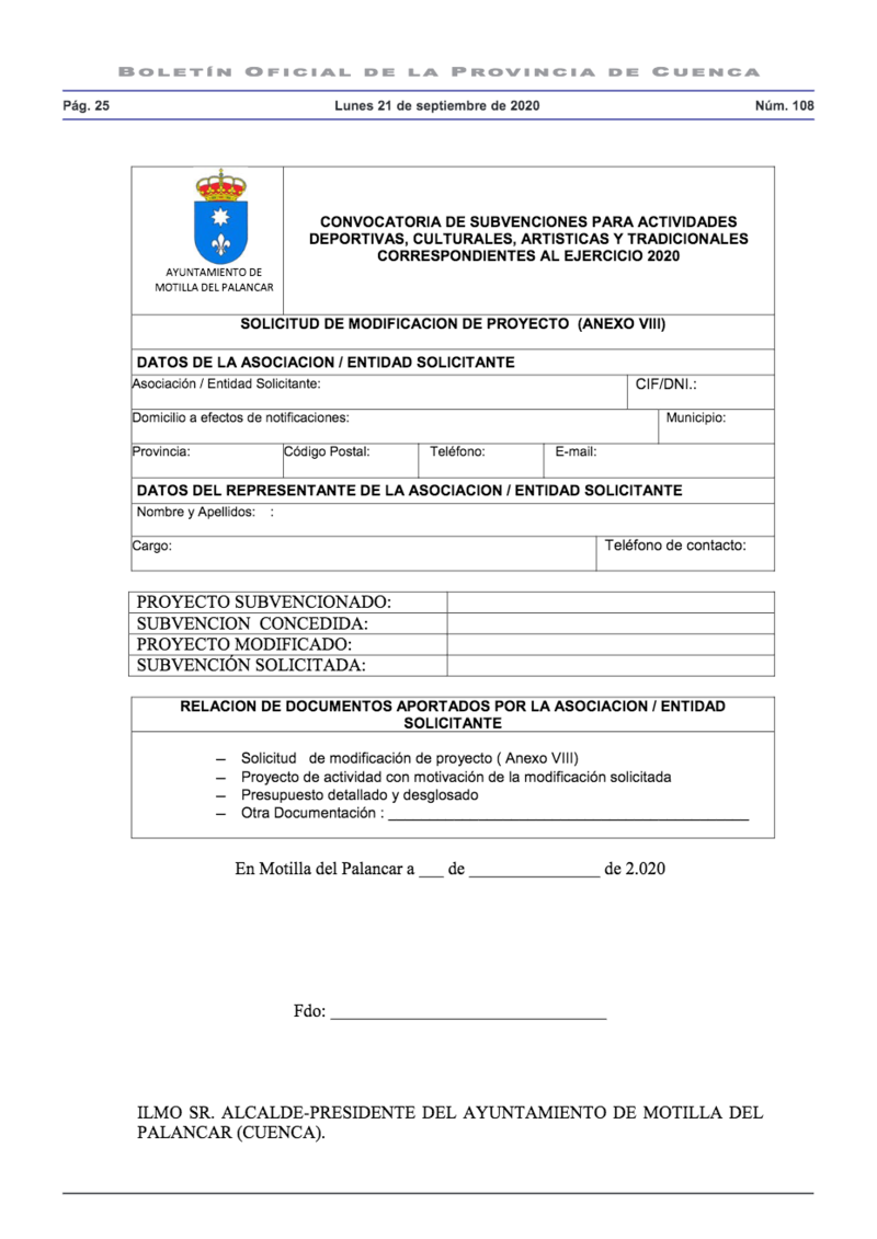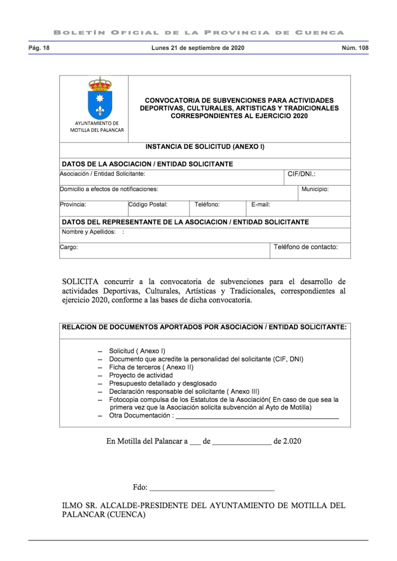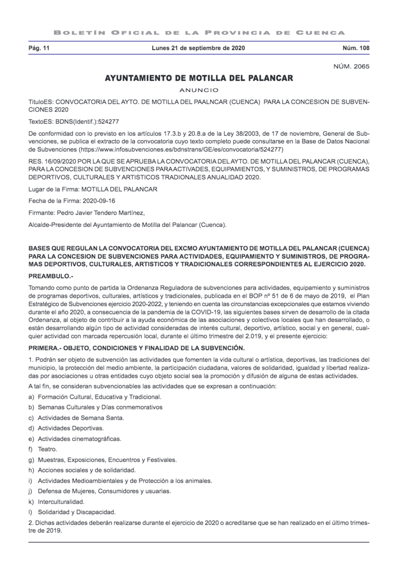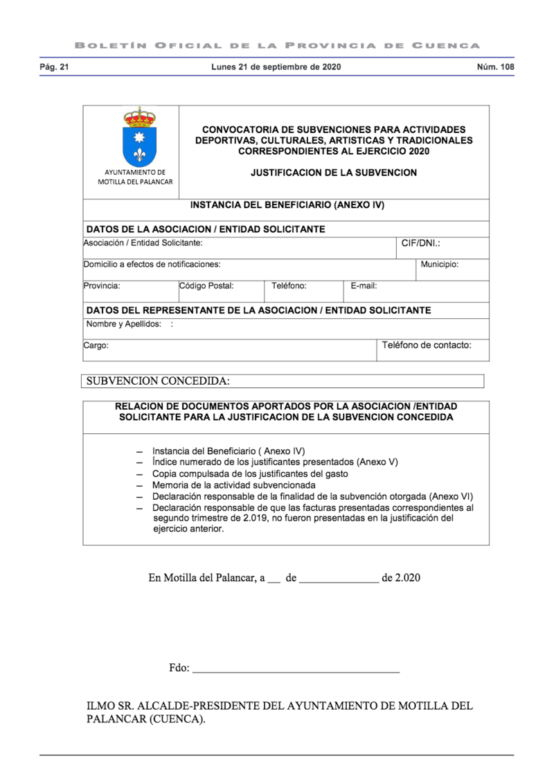 El Ayuntamiento de Motilla del Palancar ha comunicado la convocatoria para la concesión de subvenciones de este año 2020.