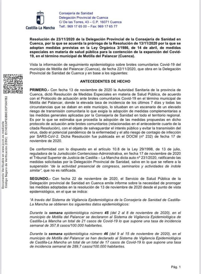 En la mañana de hoy se ha recibido la resolución de la Consejería de Sanidad que recoge la ampliación durante 10 días más a partir de hoy de las medidas especiales que prorrogan el NIVEL 3 para nuestro municipio hasta el día 3 de diciembre.