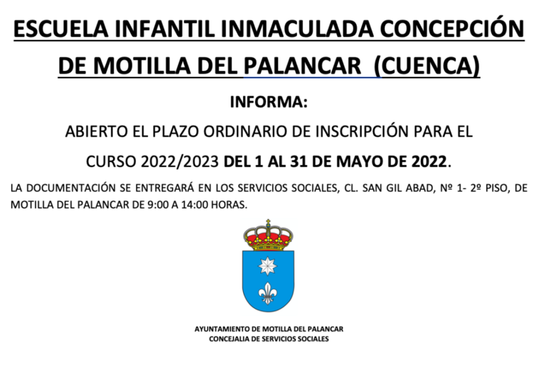 El Ayuntamiento de Motilla del Palancar ha comunicado el plazo de matriculación a la Escuela Infantil San Gil Abad de Motilla del Palancar.
