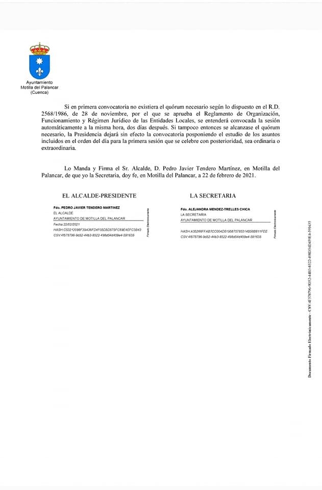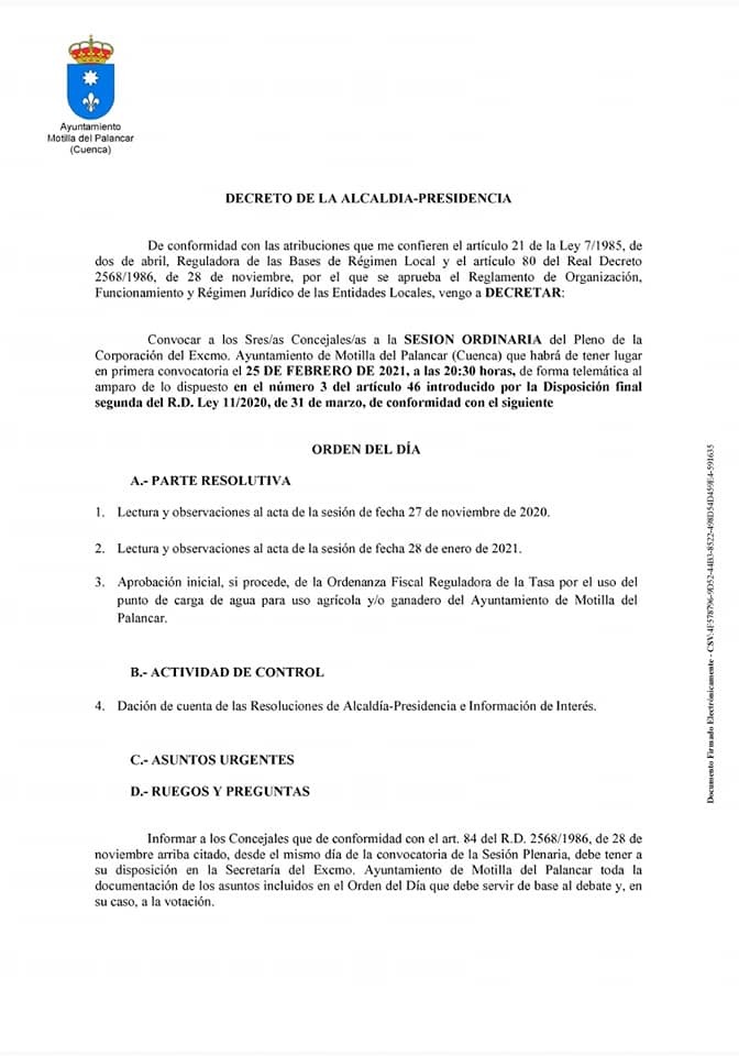 El Ayuntamiento ha dado traslado del Decreto de Convocatoria para el Pleno Ordinario de Febrero que tendrá lugar hoy 25 a las 20:30 horas de manera telemática.