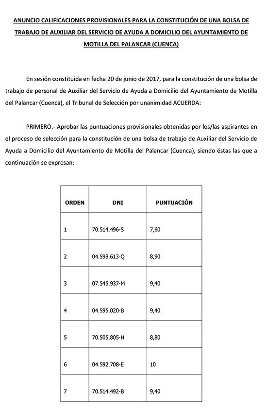 Ya han sido publicadas las calificaciones provisionales de las siguientes convocatorias a la bolsa de trabajo de Motilla del Palancar: