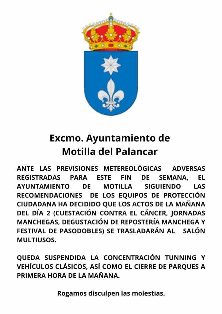El Excmo. Ayuntamiento de Motilla del Palancar ha emitido un comunicado a través de sus redes sociales para informar a los ciudadanos sobre las modificaciones en el programa de actividades debido a las previsiones meteorológicas desfavorables.