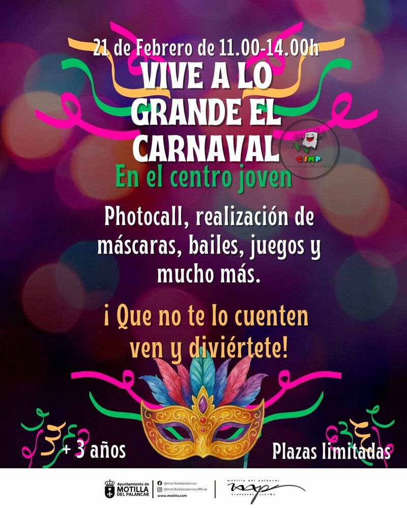 En Motilla del Palancar, el sábado 21 arrancará con una mañana dedicada a los más pequeños. De 11:00 a 14:00 horas, el Centro Joven acogerá una jornada de Carnaval con photocall, elaboración de máscaras, bailes y juegos, dirigida a niños y niñas a partir de 3 años (plazas limitadas).