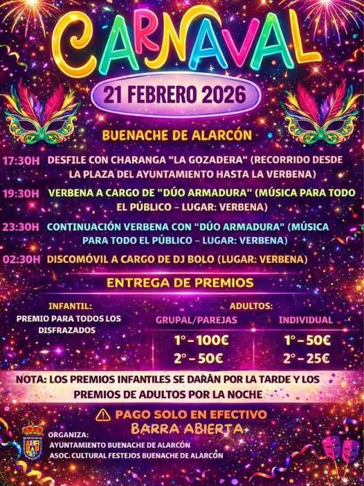 En Buenache de Alarcón, el Carnaval se celebrará el sábado 21 con un desfile a las 17:30 horas, acompañado por la charanga “La Gozadera”. La fiesta continuará con la actuación del Dúo Armadura a las 19:30 horas, con continuación a las 23:30 horas, y ya de madrugada, a las 02:30 horas, discomóvil con DJ Bolo.