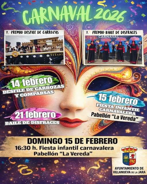 En Villanueva de la Jara, el Carnaval 2026 continuará el sábado 21 de febrero con el Baile de Disfraces, una cita festiva que pondrá el foco en la creatividad y el ambiente carnavalero en la localidad