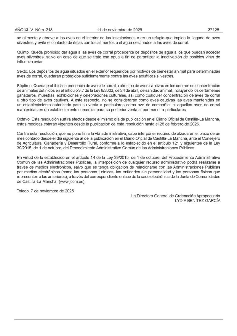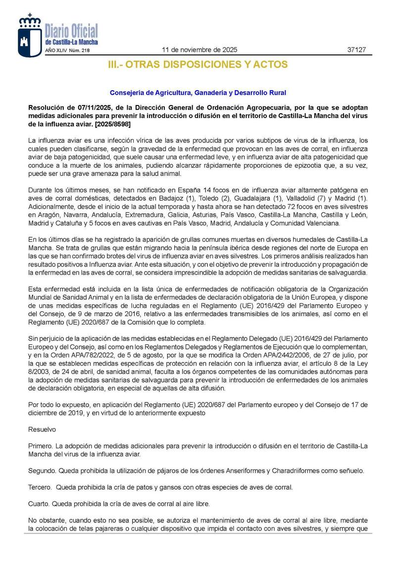 La resolución, firmada el 7 de noviembre de 2025 y publicada este 11 de noviembre, refuerza la vigilancia y amplía las medidas para prevenir la introducción y propagación del virus de influenza aviar en Castilla-La Mancha. Según la Dirección General de Ordenación Agropecuaria, el riesgo actual se debe principalmente a la llegada de aves migratorias procedentes del norte de Europa, tras detectarse varios focos positivos en humedales de la región y en otras comunidades autónomas.