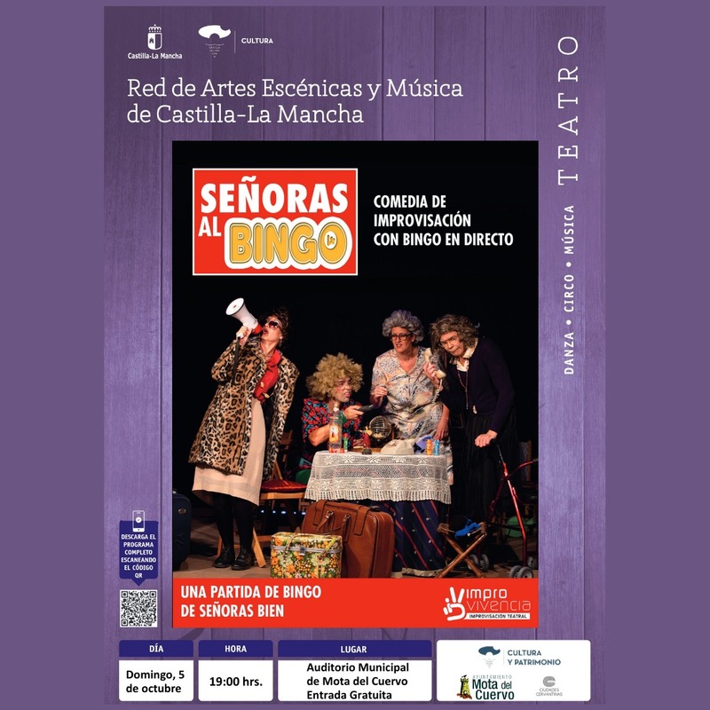 El domingo 5 de octubre, el Auditorio Municipal acoge la comedia de improvisación “Señoras al Bingo”. Una función gratuita que combina humor y un auténtico bingo en directo, con inicio a las 19:00 horas.