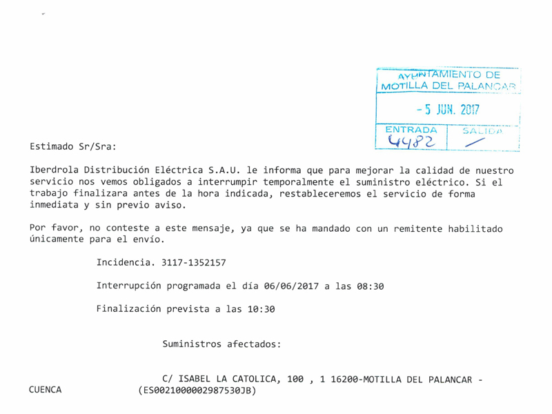 Corte de Luz en Motilla del Palancar mañana Martes 6 de Junio
