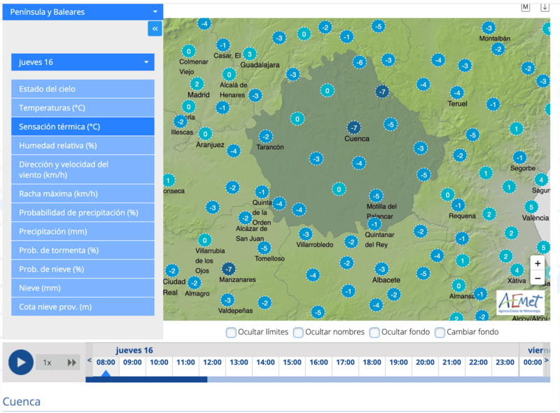 Hoy jueves 16 de enero, aunque las heladas han sido menos intensas que en jornadas anteriores, las temperaturas en el centro y norte peninsular han seguido marcando registros por debajo de los -7°C en varios puntos. En Cuenca, las condiciones permanecen adversas, especialmente en zonas bajas y despejadas, donde el frío se intensifica. La alerta amarilla por bajas temperaturas continuará activa, especialmente en áreas rurales y montañosas de la provincia.