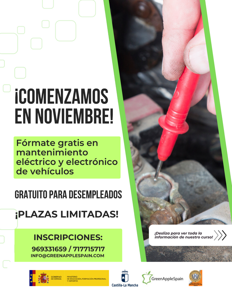Green Apple Spain ha anunciado la puesta en marcha del curso “Mantenimiento de los sistemas eléctricos y electrónicos de vehículos” (Nivel II), una formación 100% subvencionada por la Junta de Comunidades de Castilla-La Mancha y el Ministerio de Educación, Formación Profesional y Deportes. Este curso gratuito está destinado a personas desempleadas y se impartirá en Motilla del Palancar a partir del 19 de noviembre.
