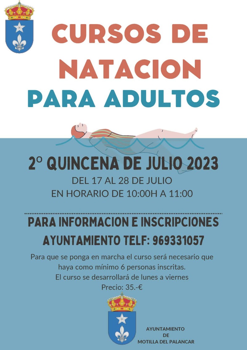 El Ayuntamiento de Motilla del Palancar ha anunciado que durante la segunda quincena de julio de 2023 se llevarán a cabo cursos de natación especialmente diseñados para adultos. Esta es una gran oportunidad para todos aquellos que deseen aprender a nadar o mejorar sus habilidades acuáticas en un entorno amigable y profesional.