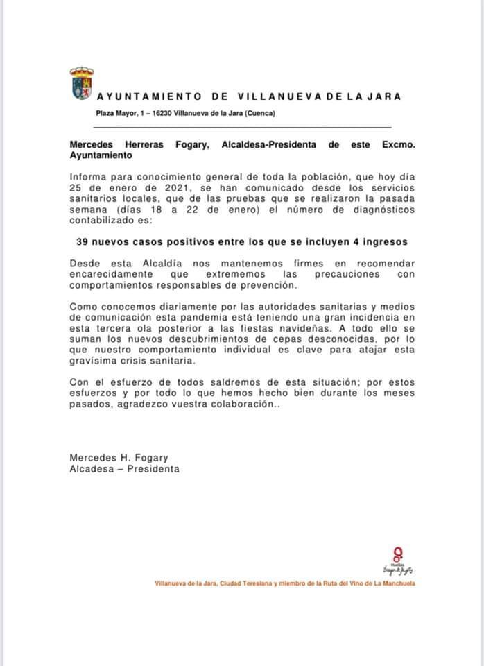 Mercedes Herreras Fogarty, alcaldesa de Villanueva la Jara, ha comunicado los nuevos casos de coronavirus en el municipio. A fecha de 22 de enero, la localidad vecina contaba con 39 nuevos casos positivos y cuatro de ellos se encuentran ingresados.
