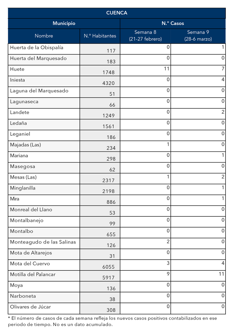 El Gobierno de Castilla-La Mancha, a través de la Dirección General de Salud Pública, ha confirmado que el municipio de Motilla del Palancar cuenta con 11 casos POSITIVOS de coronavirus.