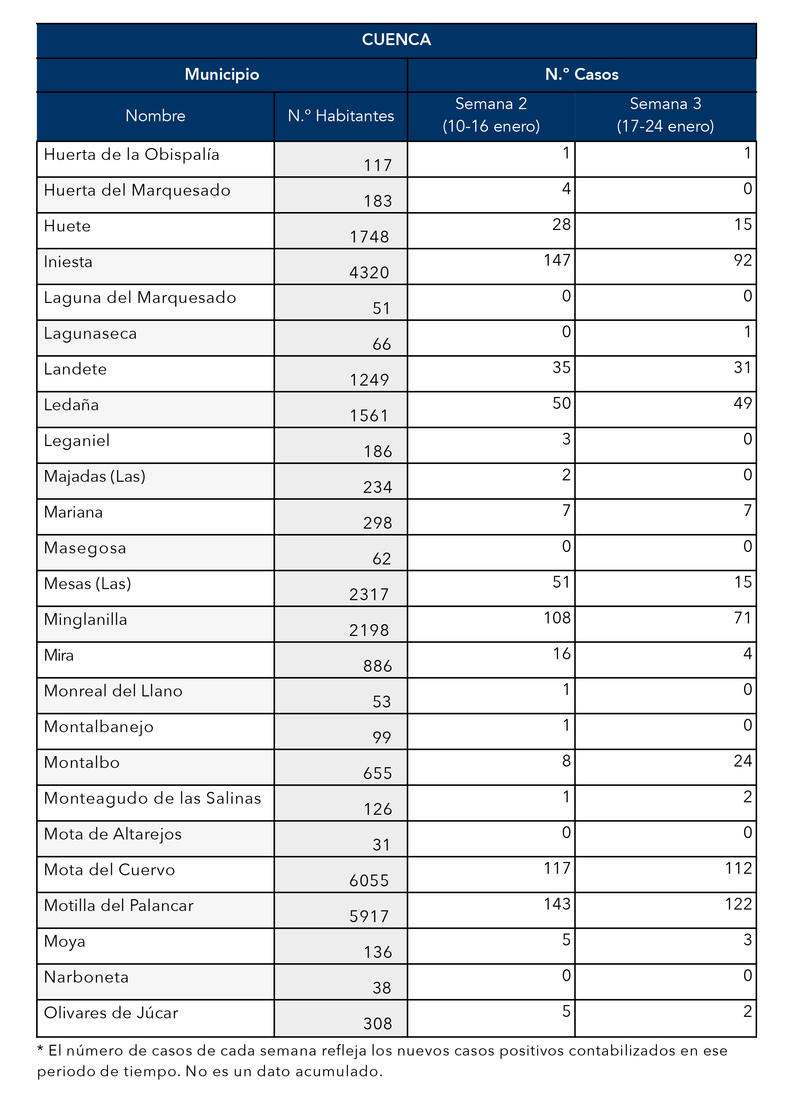 El Gobierno de Castilla-La Mancha, a través de la Dirección General de Salud Pública, ha confirmado que el municipio de Motilla del Palancar cuenta con 122 casos POSITIVOS de coronavirus, por lo que la localidad sufre un ligero descenso en el número de casos positivos.
