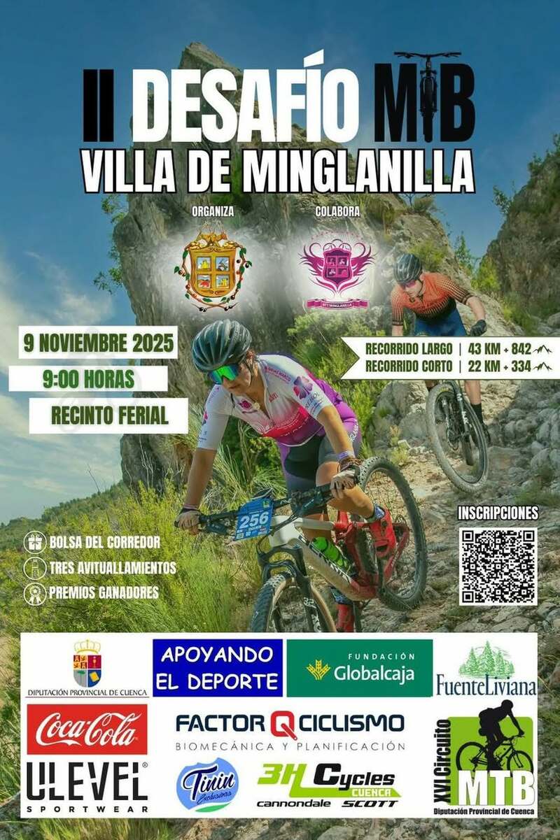El II Desafío MTB Villa de Minglanilla pondrá el broche final al XVI Circuito MTB Diputación de Cuenca este domingo 9 de noviembre desde las 9:00 horas en el Recinto Ferial. La prueba, organizada por el Ayuntamiento de Minglanilla y el BTT Minglanilla, contará con dos recorridos: uno largo de 43 km y otro corto de 22 km, atravesando parajes naturales del entorno.