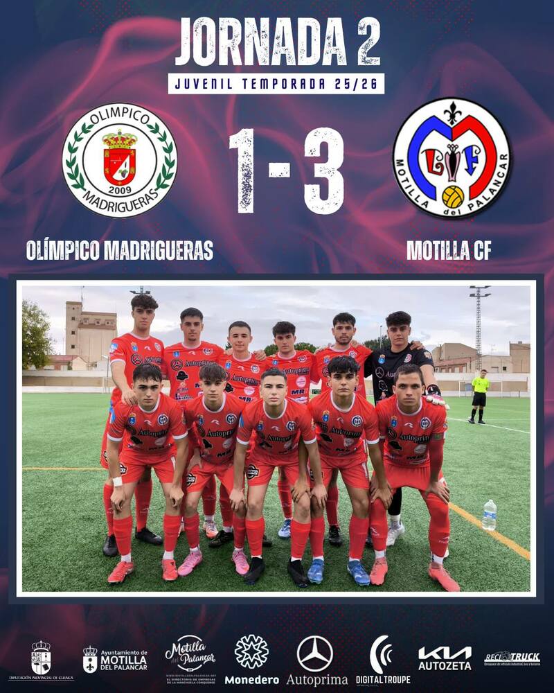 El equipo juvenil del Motilla CF sumó su segunda victoria consecutiva al imponerse por 1-3 al Olímpico de Madrigueras el pasado 10 de octubre en el Campo de Fútbol “San Jorge”. Los motillanos firmaron un gran encuentro fuera de casa, mostrando solidez defensiva y eficacia en ataque ante un rival exigente.