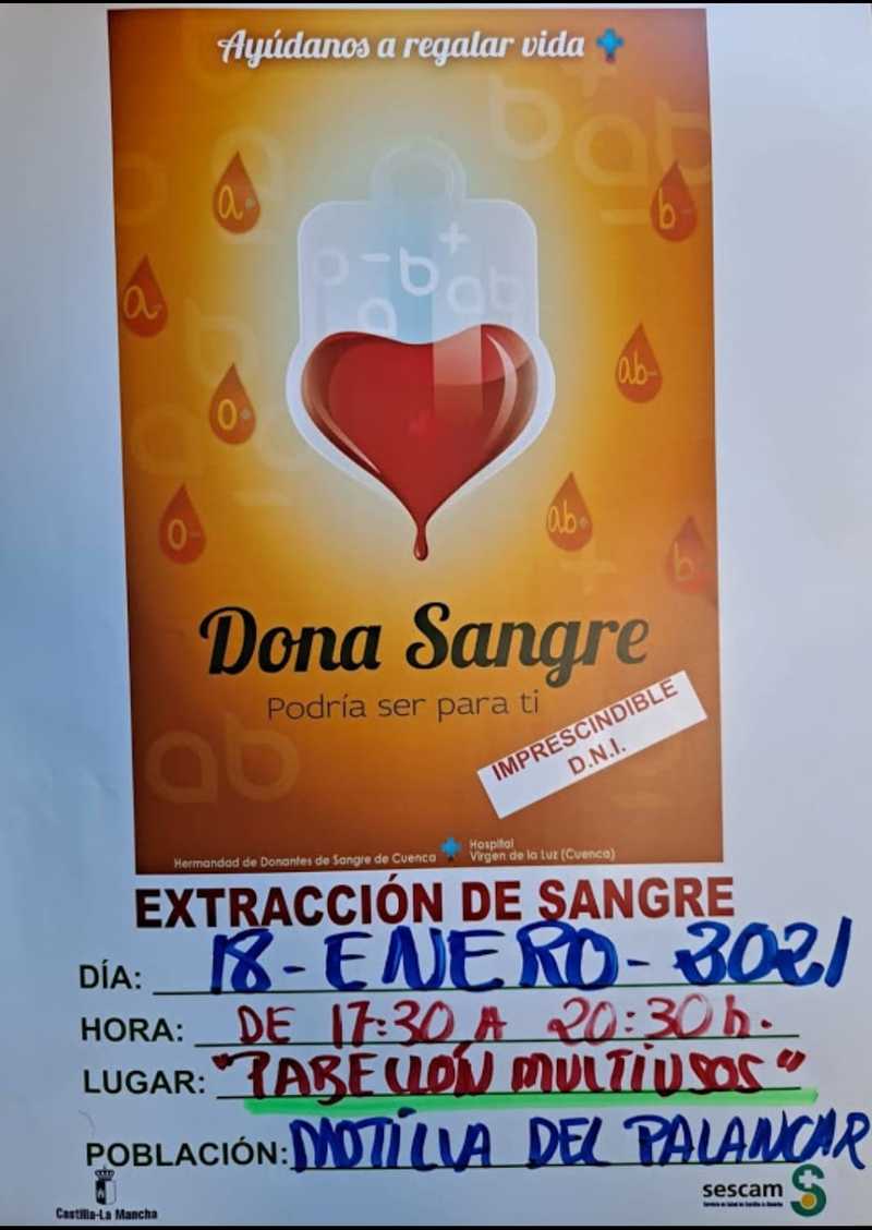 Los vecinos de Motilla del Palancar podrán donar sangre este lunes 18 de enero de 17:30 a 20:30 en el Pabellón Multiusos. La extracción de sangre se realizará gracias a la hermandad de Donantes de Sangre de Cuenca.