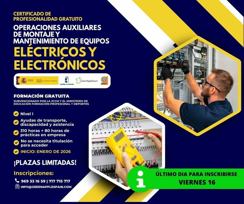 Green Apple Spain mantiene abiertas hasta el 16 de enero las inscripciones para dos Certificados de Profesionalidad gratuitos y oficiales que comenzarán en enero de 2026, dirigidos a personas que buscan mejorar su empleabilidad en sectores con alta demanda laboral como la electricidad, la electrónica y la atención sociosanitaria.
